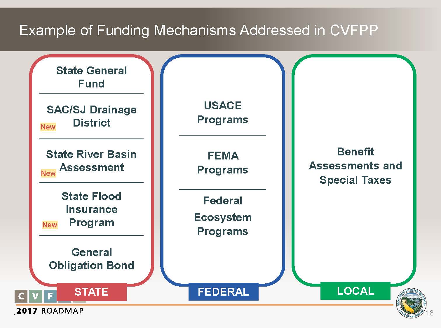 Mr. Mierzwa said there were three new mechanisms they covered in the update. “First is reestablishment of existing Sacramento-San Joaquin drainage district, which is administered by the Central Valley Flood Protection Board,” he said. “We also talked about in conjunction with the California Water Plan of the feasibility of a state river basin assessment in which water actions within river basins would be assessed and then managed through those basins. This would just be a small contribution to the CVFPP, and then we’ve talked about studying the feasibility of a state flood insurance program, which could pass cost savings on to Californians who right now are subsidizing flood insurance damages across the US. I will add that right now, the cost estimates of the overlays to the National Flood Insurance Program for Hurricanes Harvey, Irma, and Maria is somewhere between $50 and $100 billion. At the federal level, they discuss Army Corps programs, in addition to the federal emergency management programs and other federal ecosystem programs such as those with the Natural Resource Conservation Service.”
