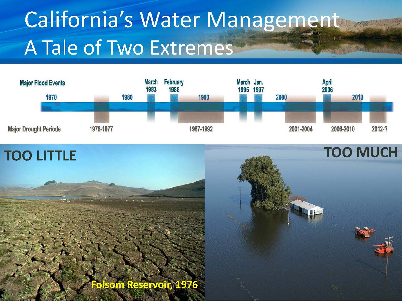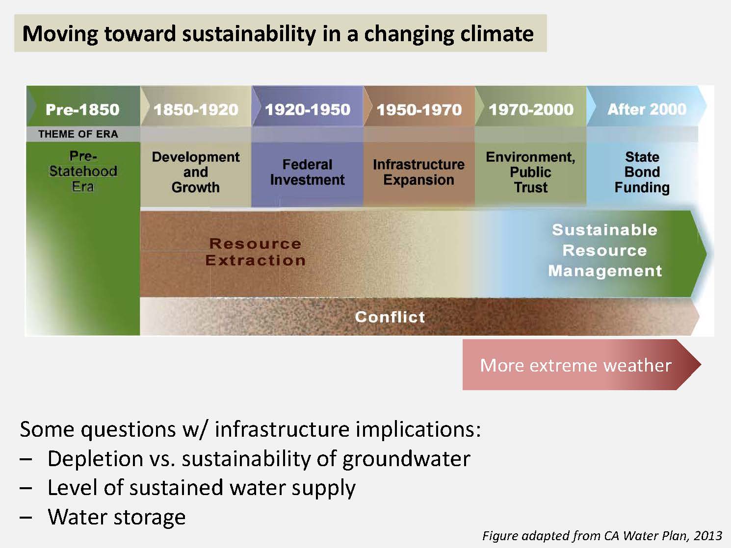 He presented a slide from the 2013 Water Plan, noting that it’s sort of a history of California around water issues. “As we try to move toward a period of sustainable resource management and reduced conflict, now we have one more arrow that we need to add that is affecting how we address these challenges, and that is the more extreme weather,” said Dr. Bales.