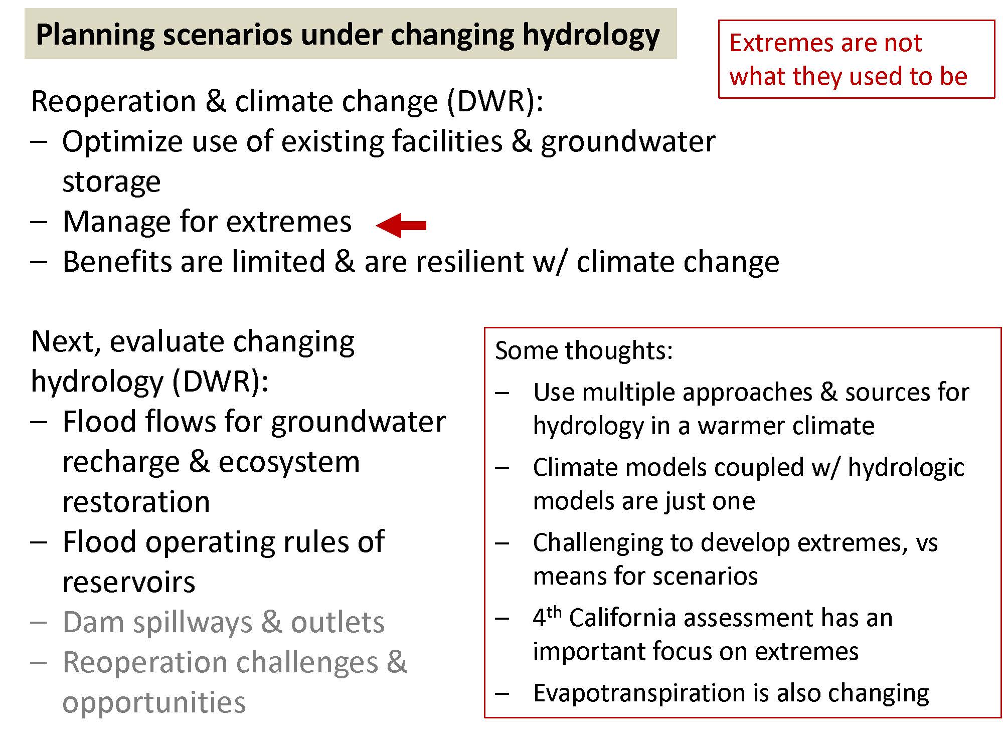 He then turned to planning scenarios under changing hydrology. “I agree completely with the first three points and optimizing use of existing facilities, and this is seeing that the benefits, although limited from the initial analysis, are resilient to climate change, but managing for extremes is the key point there,” he said. “Hopefully DWR will be moving ahead with that phase fairly soon on integrating the flood flows, that is the headwater and groundwater recharge systems and updating some of the hydrology under climate change scenarios.”