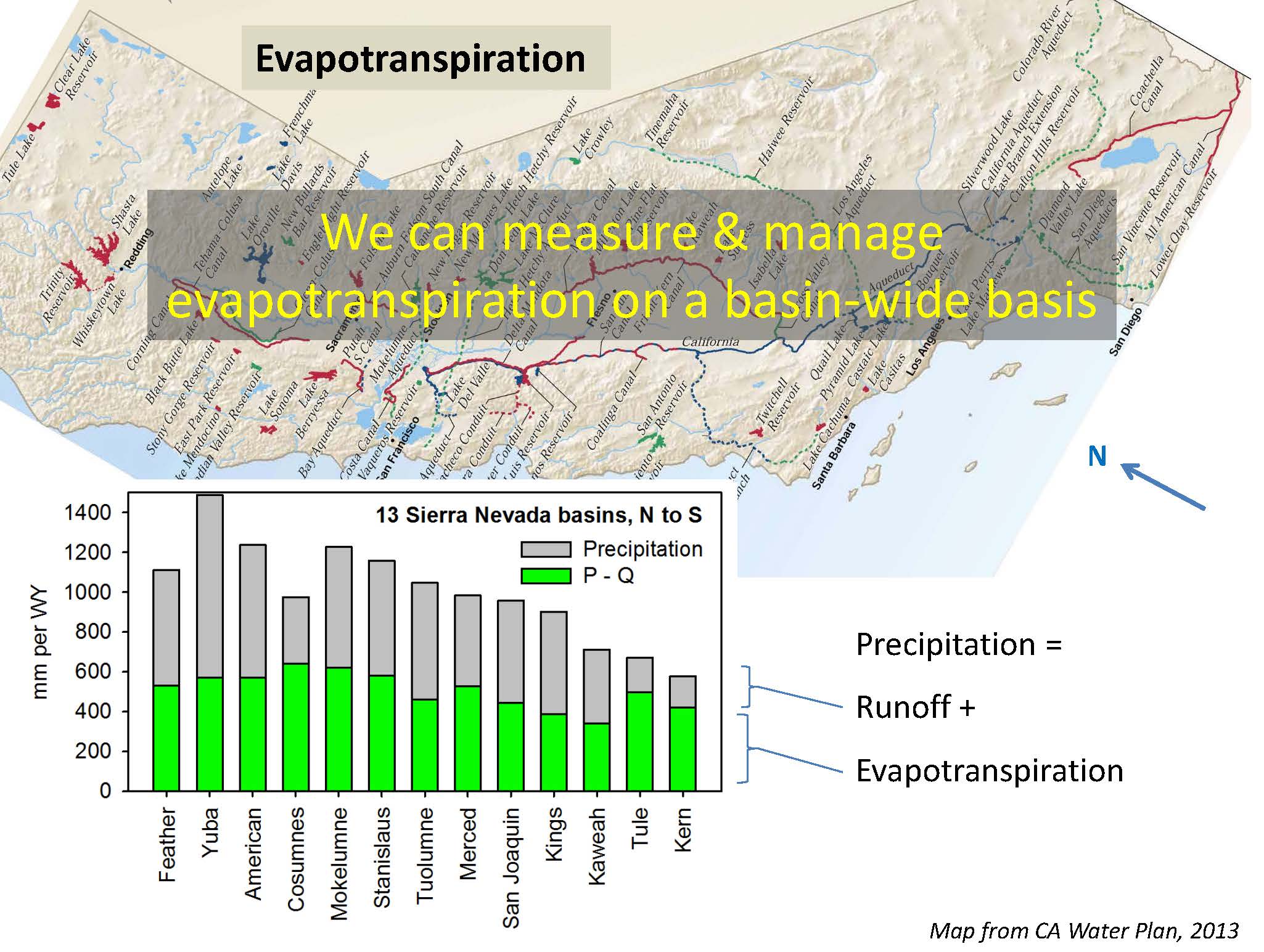 Dr. Bales said that evapotranspiration is also changing and that has implications for both reoperation and storage. “Evapotranspiration is changing for two reasons,” he said. “I’ve turned California on its side here, not necessarily so I can fit it on a graph but everything drains to San Francisco Bay to the Sierra Nevada that way. On the bar graph, I have the total precipitation on average which is the total height of the bar. The green shaded part below is the evapotranspiration, basically calculated as precipitation minus reconstructed flow at the rim dam. What you’ll notice is that evapotranspiration doesn’t vary that much across the Sierra Nevada. It’s more in the lower elevation basins because the growing season is longer for the forests. It’s smaller in the higher elevation basins like the Kings or Kaweah because there’s a shorter growing season for the forest.”