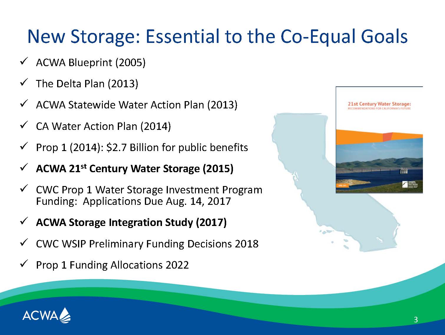 Mr. Bolland said that for more than a decade, ACWA released a blueprint intended to rally water agencies around a vision for multiple objective management. The Delta Plan adopted in 2013 reflected a lot fo that; the Statewide Water Action Plan that ACWA put out, they believe influenced the California Water Action Plan in a strong way. Then Prop 1 came along in 2014, as did SGMA, and a lot of things that kind of fit together in a policy framework; there’s $2.7 billion for public investments and storage. The Water Storage Investment Program’s regulations have been adopted, and applications are in the hopper right now.