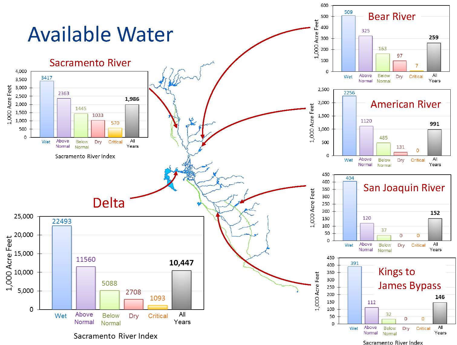 The study determined that the proposed storage projects would add a total asset of 3.5 MAF of combined storage, but they wanted to determine whether there was water in the system to put into these projects. “Obviously those projects themselves need to make that case on a more technical level and they are doing that, but what we did in our modeling was look at how the system works now in terms of hydrology, and the key message is variability,” he said. “It’s extremely important to realize that the way we’re going to find the water in the system is to look at flows in terms of timing, and so if you see, the years are classified as wet, all the way down to critically dry years, and then the averages. Averages are just a tool to convey information. In many ways, they are not helpful. You need to be looking at the ways in which the different water years perform. The geography is extremely important, and again, those arrowheads point to areas within the system where we thought there was water available, if it could be used strategically in storage and put into either surface or groundwater storage as an asset to the system.”