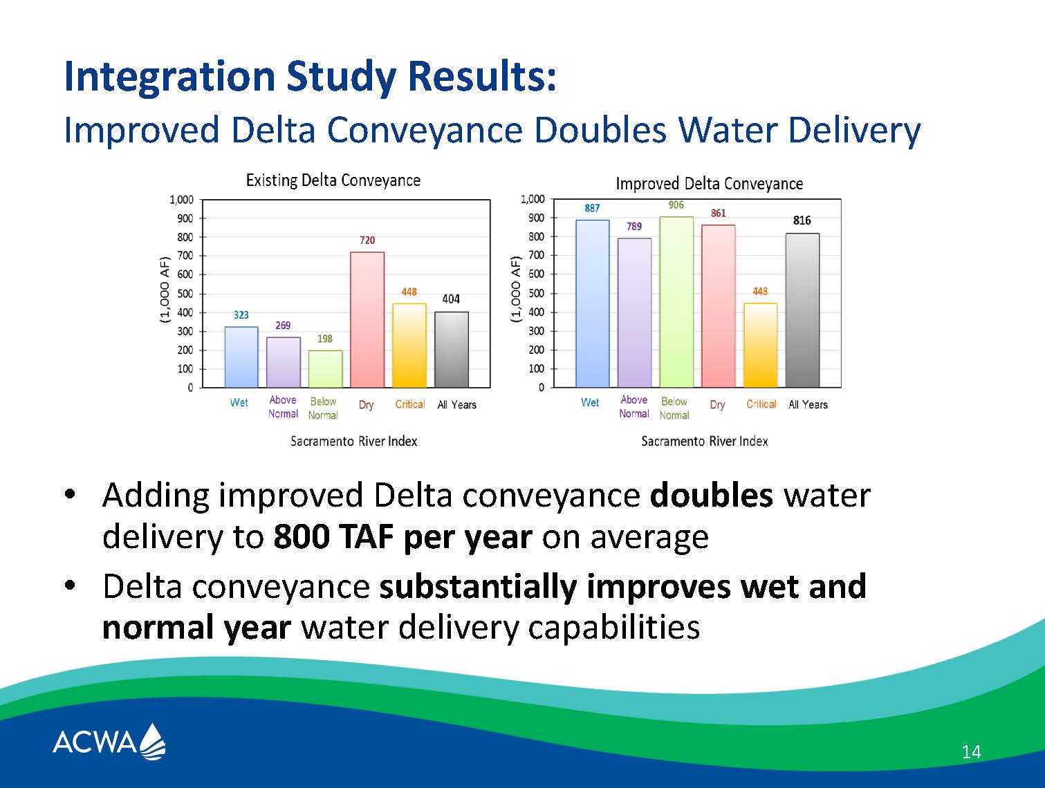 Mr. Bolland said that another important point is that with or without the Delta conveyance, the Water Fix, the results are striking. “In fact, we get significant benefits in dry and critically dry years under existing conveyance, but under improved Delta conveyance, we get extremely high, impressive, results – almost double the results under all different water years. That’s important because we need to be able to operate when we’ve got the assets and move those assets to where they can be used.”
