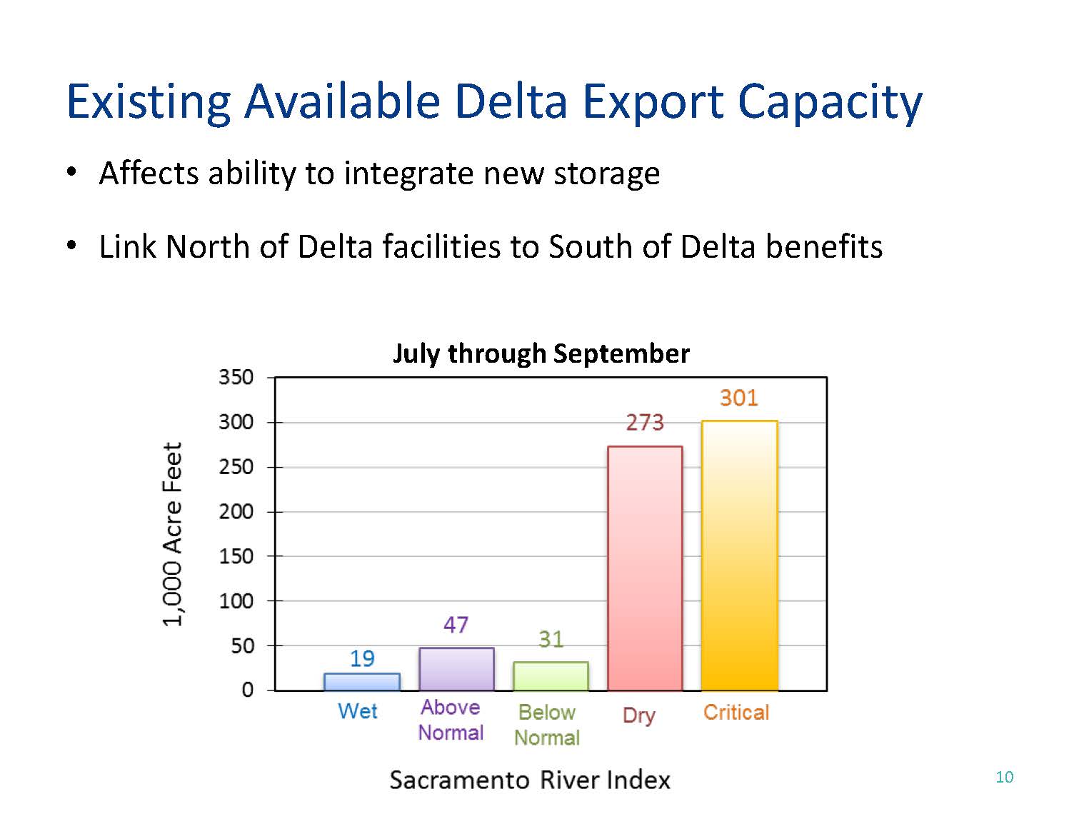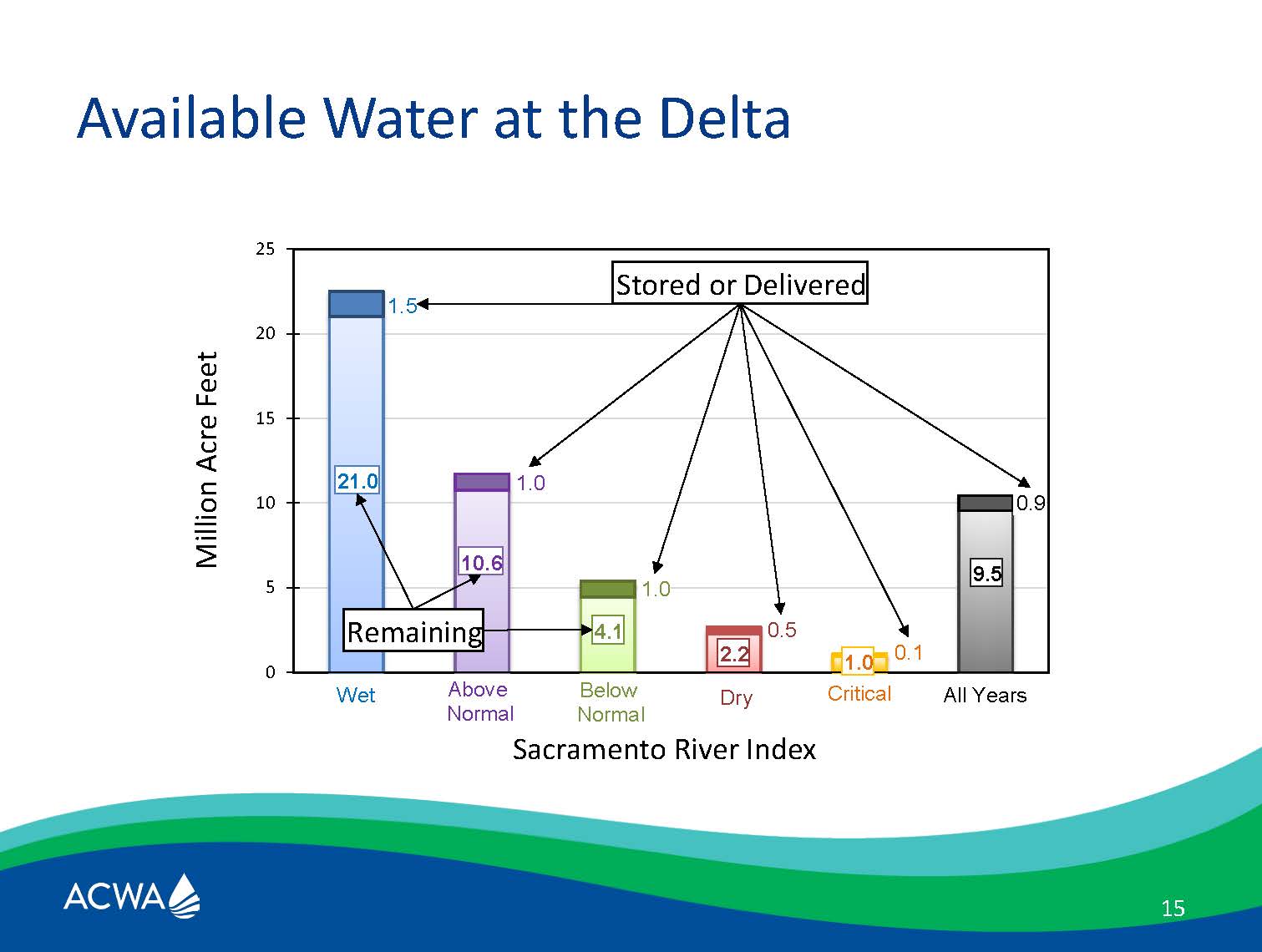 David Bolland answered first. “We used the current baseline and we just went ahead and assumed that going forward; we didn’t try to project any kind of changes to that. Specifically as it relates to decisions that are before the water board on flows and basin plans and so forth, we didn’t try to drop that in, but one thing I think that does come out is that that significantly affects the ability we have to operate the system. We essentially did a modeling exercise where we just built the baseline into the model, added the storage, and got the results. When we understand how that was done and our modelers are able to report out scenarios and why we got the results we got, it’s clear that the regulatory baseline does present a challenge for operations, and if we add to that challenge or do it in a way that’s one-dimensional and not integrated, we could basically have less value for those assets. In some ways, we didn’t try to presuppose how to use those assets, but clearly one answer would be, can you just dedicate more water to flows? Yes we could, but that means we can’t use it for other stuff, so the results of our study, we could talk a lot about scenarios with those, but it’s not built in other than just the baseline.”