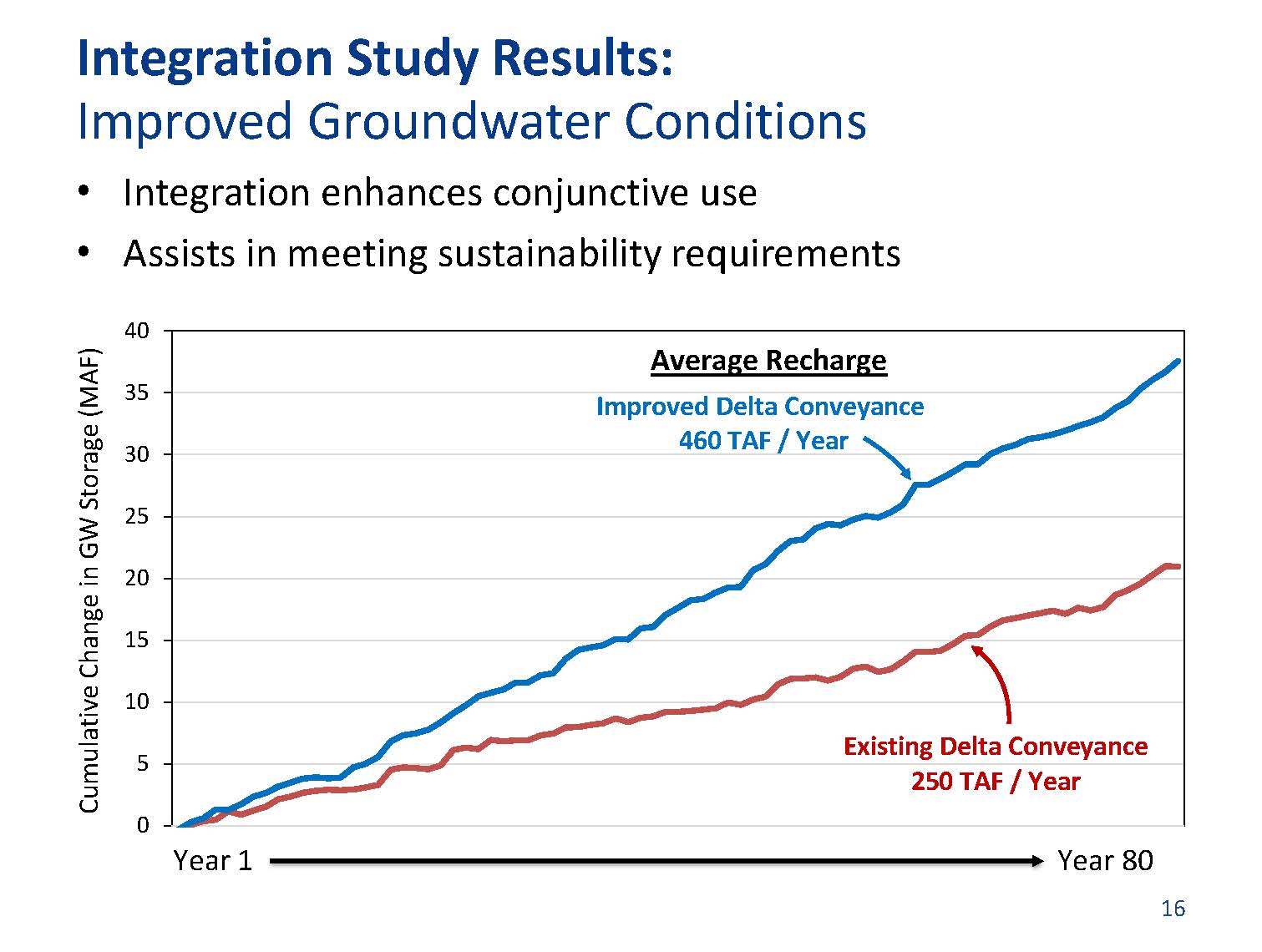 He then presented a graph showing how the additional storage projects could help in groundwater recharge. “Basically it’s like a bank account that you’re putting a little bit of water into every year and cumulatively, it’s an important amount of water,” he said. “With the existing system, we get about 250,000 acre-feet per year on average. Again, it’s not an average situation, but over that period, that accounts for a fair amount of water. That water can then be moved into groundwater storage; the way ran the model focused on moving it into the southern part of the San Joaquin Valley and trying to deal with overdraft there. So again, 250,000 acre-feet. It doesn’t solve the problem, it’s not a silver bullet, but it’s a significant down payment on the problem, and if you have conveyance, you double the amount of water that’s available.”