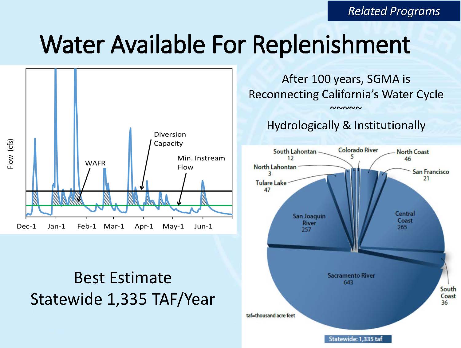 The passage of the Sustainable Groundwater Management Act has closed the loop on the state’s water cycle, Mr. Guivetchi said. As part of the legislation, the Department of Water Resources was directed to do a study to determine how much more surface water is there available for groundwater replenishment. He indicated that the final report is due out in October, and it basically found that on average, there may be 1.3MAF per year available for groundwater replenishment. But he pointed out that California is not a bathtub. “That water is available in different parts of the state and would only make sense for replenishment in a more local regional setting,” he said.