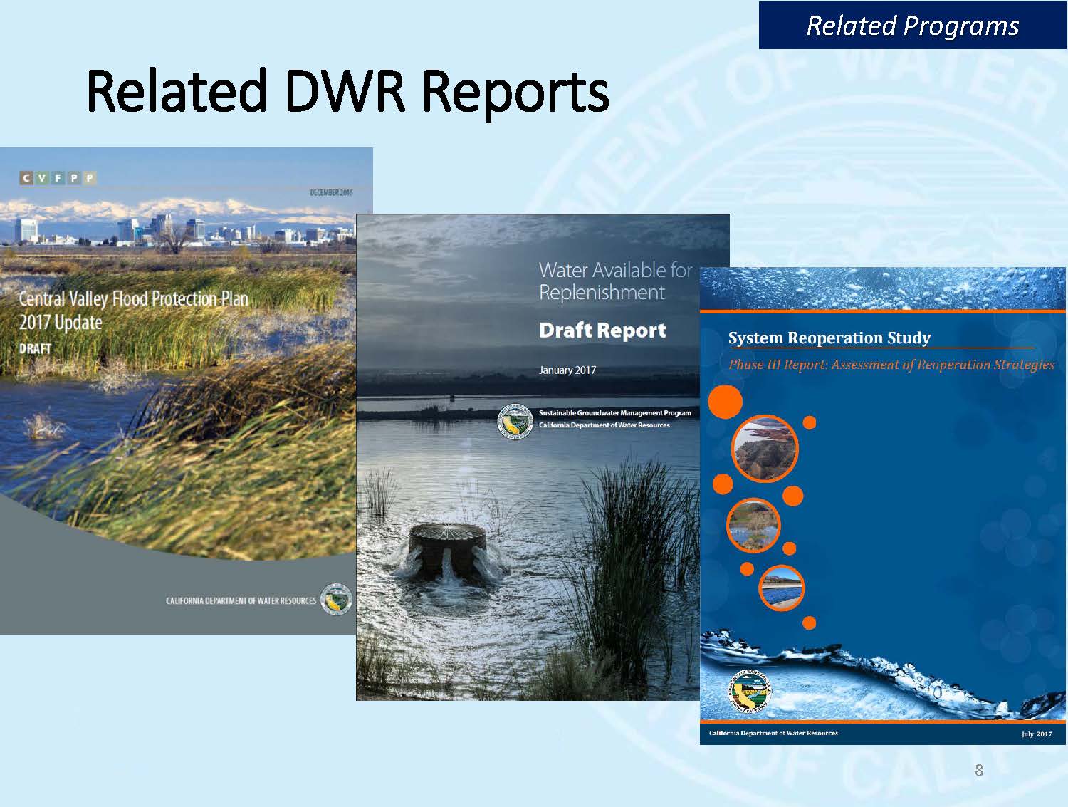 Three reports have come out in the last year or two: The Central Valley Flood Protection Plan, the Water Available for Replenishment Report, and Phase 3 of the System Reoperation Study. These reports all fit together, Mr. Givetchi said. “DWR was directed by the legislature and the Governor in 2008 to conduct the System Reoperation Study to see how much more could we get out of our existing water management infrastructure and the way that we manage water,” he said. “We were directed to do that by taking an integrated approach with flood management, water supply management, and water quality management concurrently while we try to optimize or see how much more we could wring out of our water management system.”