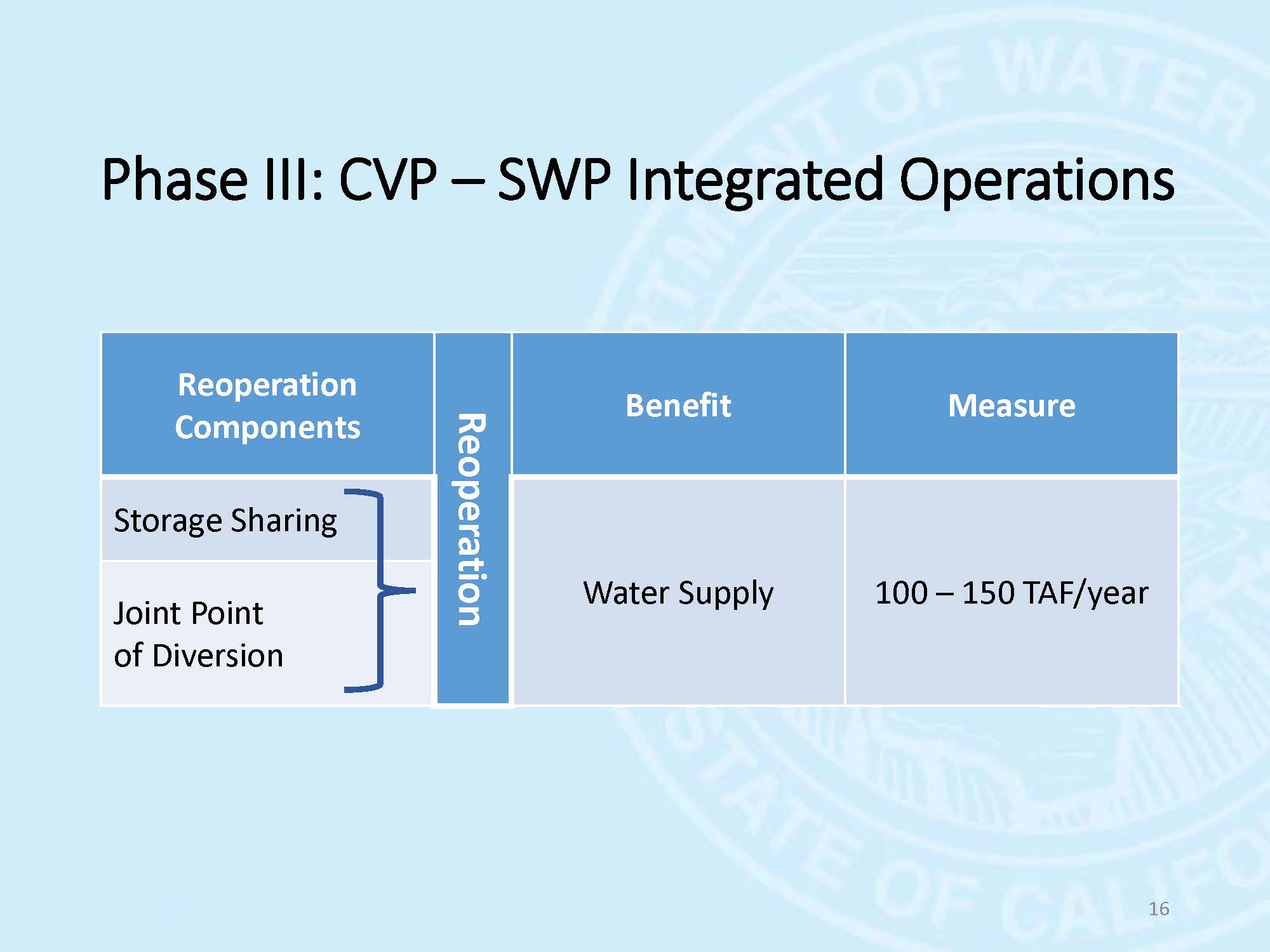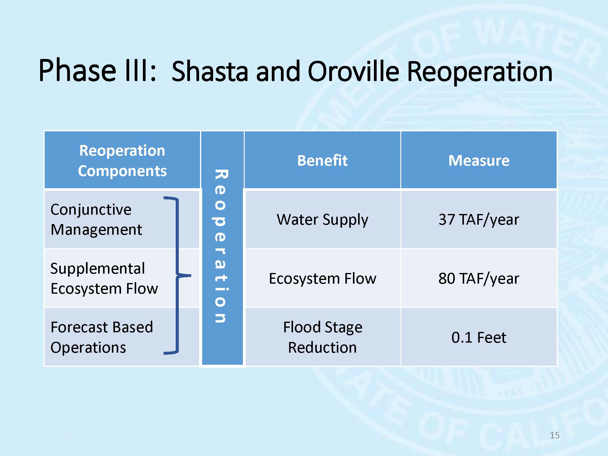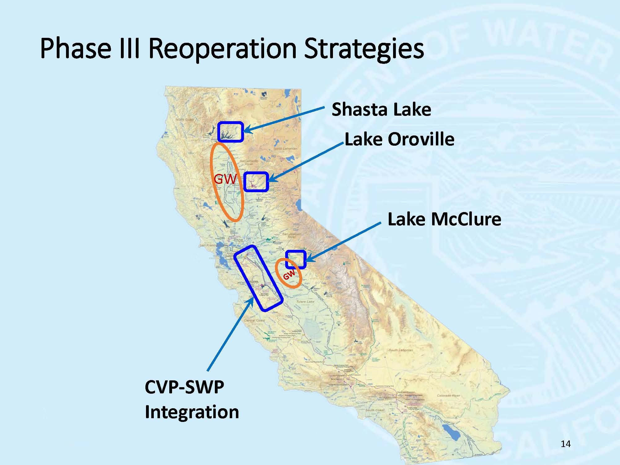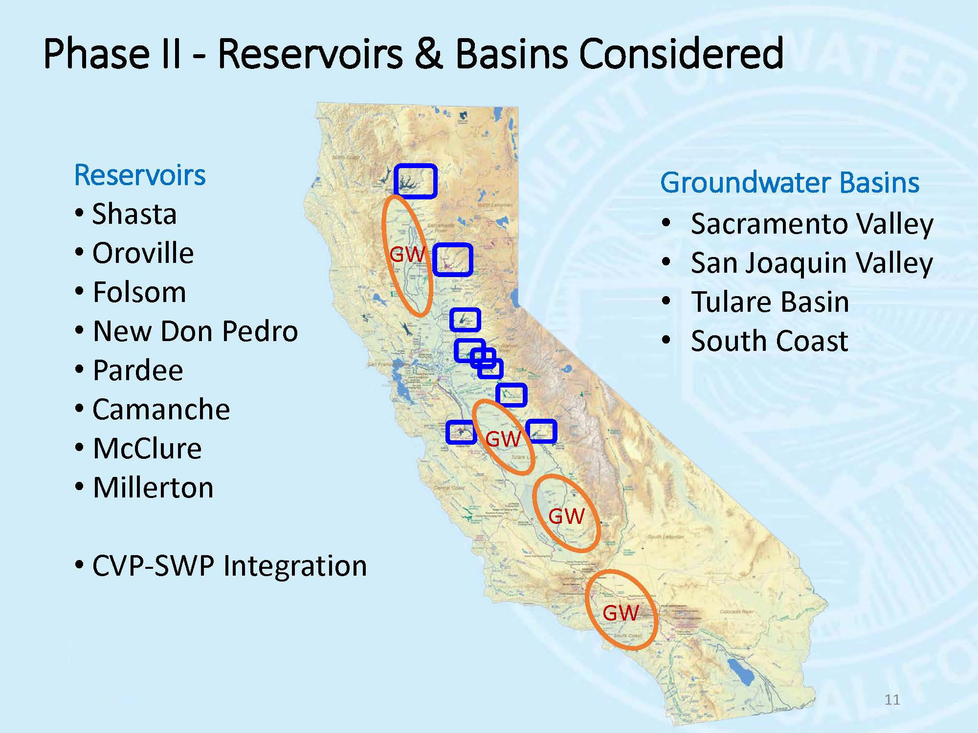 They found groundwater districts were very enthusiastic because they saw this reoperation study as a potential source of replenishing the groundwater basins, but the reservoir operators, not so much. So for phase 2, they looked at Shasta, Oroville, and Lake McClure, both in combinations and individually. They looked at reoperation strategies, such as conjunctive management; providing supplemental flows, especially in the springtime for ecosystem management; and what could be gained by encroaching into the flood reserve space with what they call Forecast Based Operations, as well as considered the joint operation of the Central Valley and State Water Project by looking at shared storage and joint point of diversion. In phase 3, they did a more detailed study on these particular strategies.
