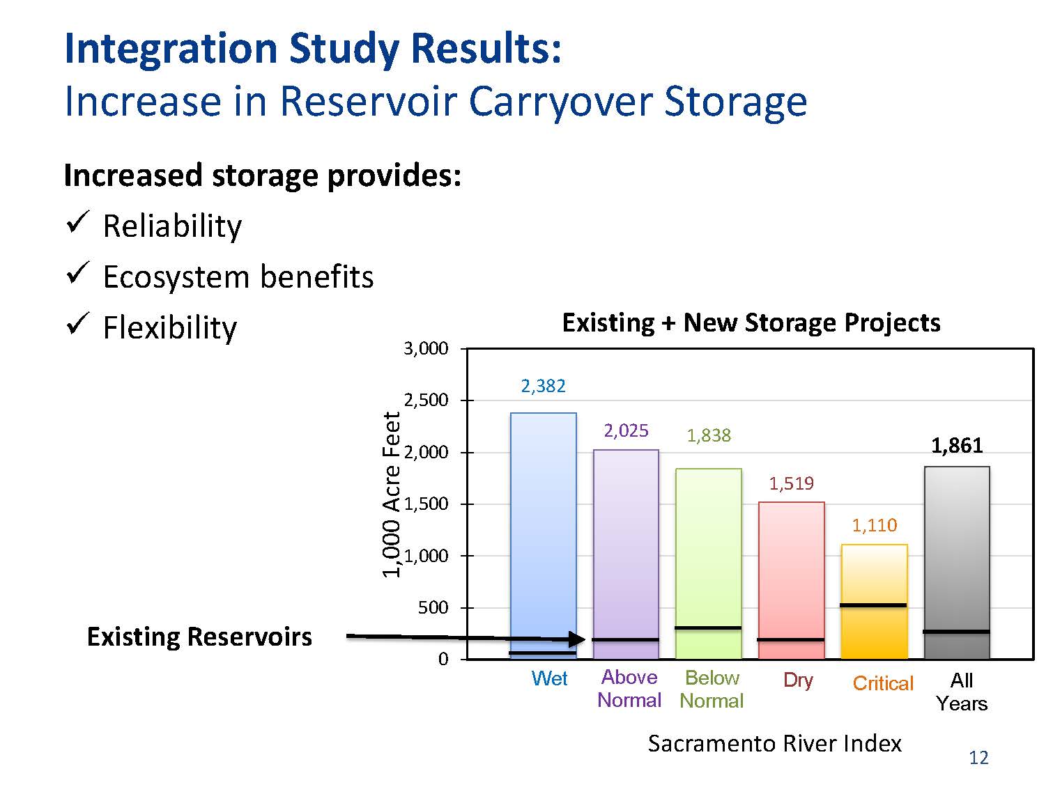 “When we did the system reoperation study, we did pretty much use the current regulatory baseline, with the exception of the forecast based operation – we actually did tweak the Corps of Engineers rule curves as part of the strategy for forecast based operations,” said Kamyar Guivetchi. “The other thing that would be helpful for the Commissioners as you review our respective studies is as it turned out, the analytical approach and assumptions we used for the system reoperation study are essentially the same or very similar to what ACWA used, so they are comparable as far as how the new facilities that ACWA considered would affect the current system as we modeled it for the system reoperation study.”