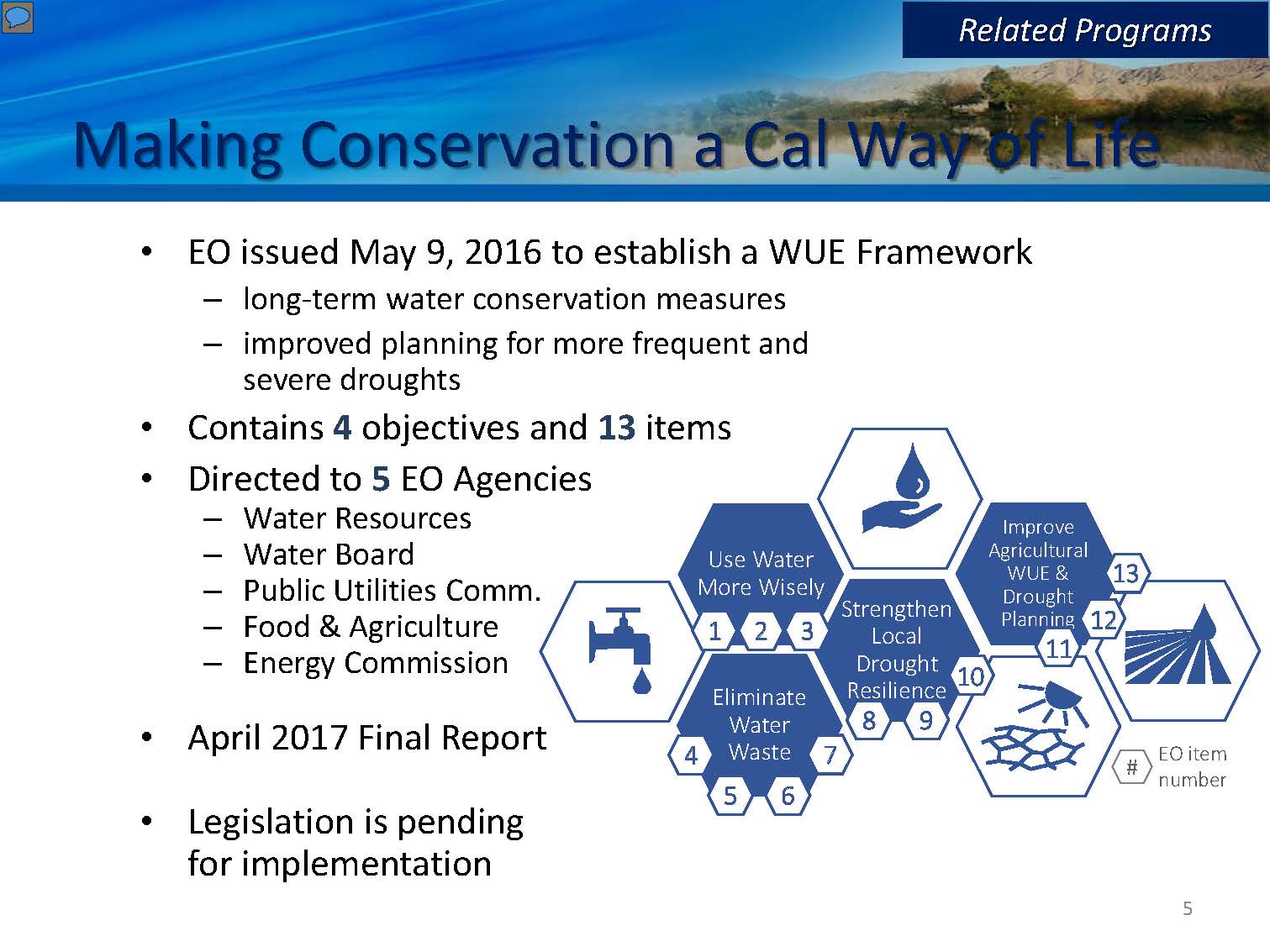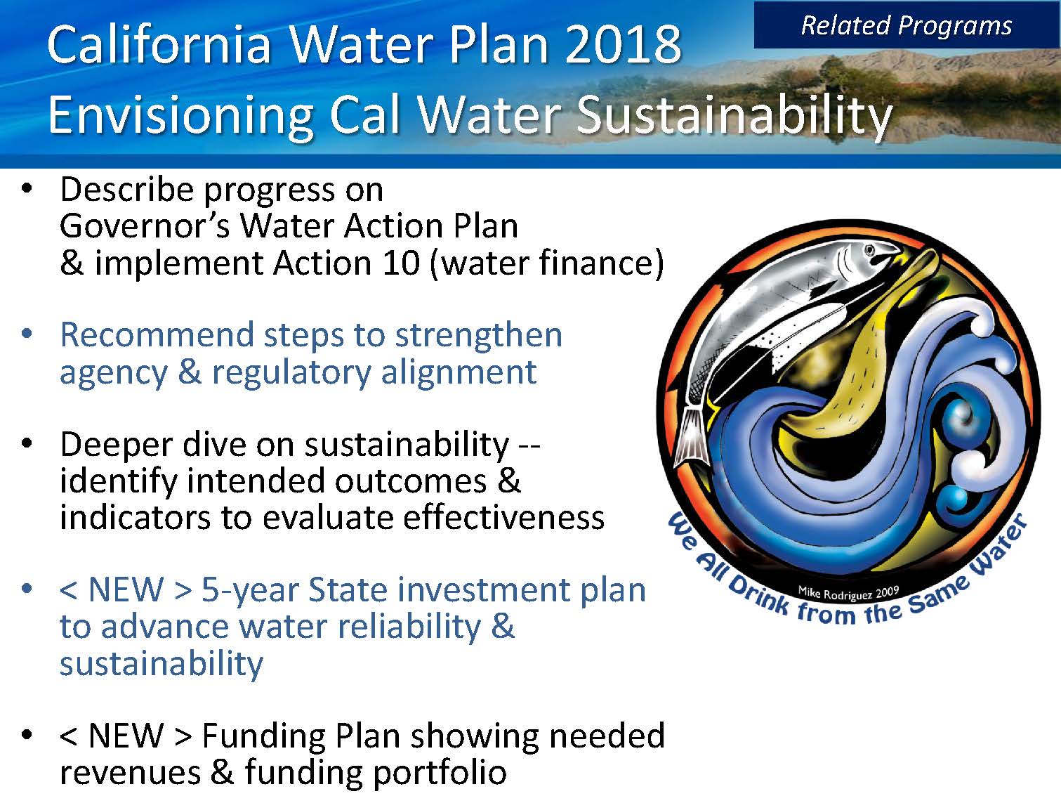 The water plan update will focus on defining what is really meant by sustainable water resource management in terms of outcomes and indicators. The Governor’s Water Action Plan calls for making the most efficient use of water and making water conservation a California way of life. “In fact, it has been our growth and development that has put that water to use, and we have to be able to, while continuing to grow and develop, do it in a way with more efficient water use,” Mr. Guivetchi said.