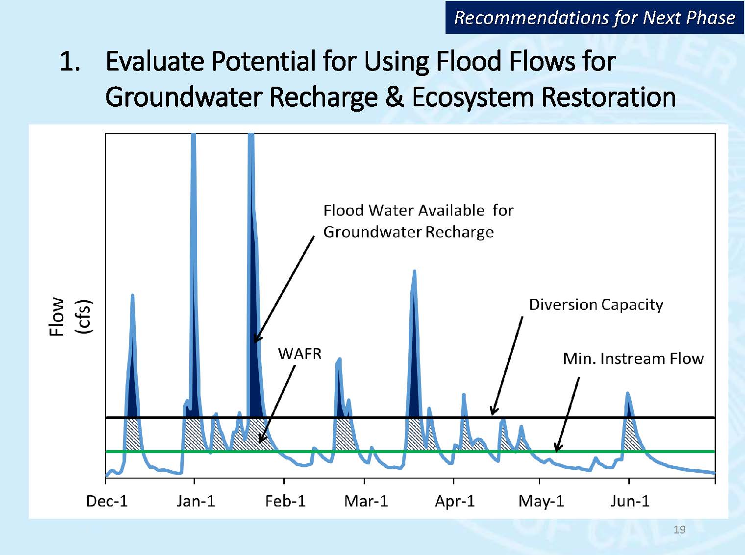 “Now only would it be lost, it will be a significant flood risk, because our current flood infrastructure is not designed to manage some that additional flashy flows,” said Mr. Guivetchi. “That’s why this approach of taking some of the flood flows and putting it on agricultural and working lands on a volunteer basis, and some farmers are already looking for these opportunities to put that water on their land and use it as an opportunity to recharge their groundwater basins. While they are doing that, they are actually reducing the flood risk, in one of two ways: either by reducing the elevation of the floodstage and the river at that time or by allowing the flood reserve water to actually be put into the ground before that next storm comes, so you’re actually using the flood reserve space as water supply yield that could be banked in the ground. That goes back to the diversion capacity, so if you’re thinking now of conveyance facilities that would be needed to get it onto ag lands and other recharge basins, that increases your ability to divert these flood flows at the time that they are there.”