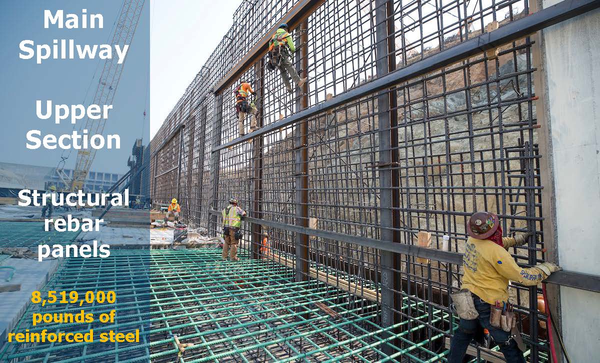 The rebar in the walls is being built and connected into the chute rebar for extra strength; there is a lot more rebar being used then back in the 60s – there is 8,519,000 pounds of rebar being used in the spillway construction.