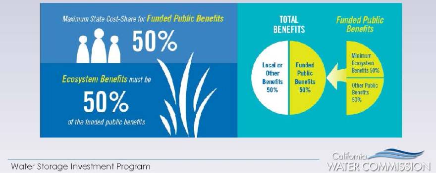 The statute sets a limit on the state’s cost share to a maximum of half of the total project costs, and of the amount funded, half of the amount must be for ecosystem improvements. The statue requires that the project must also provide measurable ecosystem improvements to the Delta or tributary and be consistent with the Wild and Scenic Rivers Act.