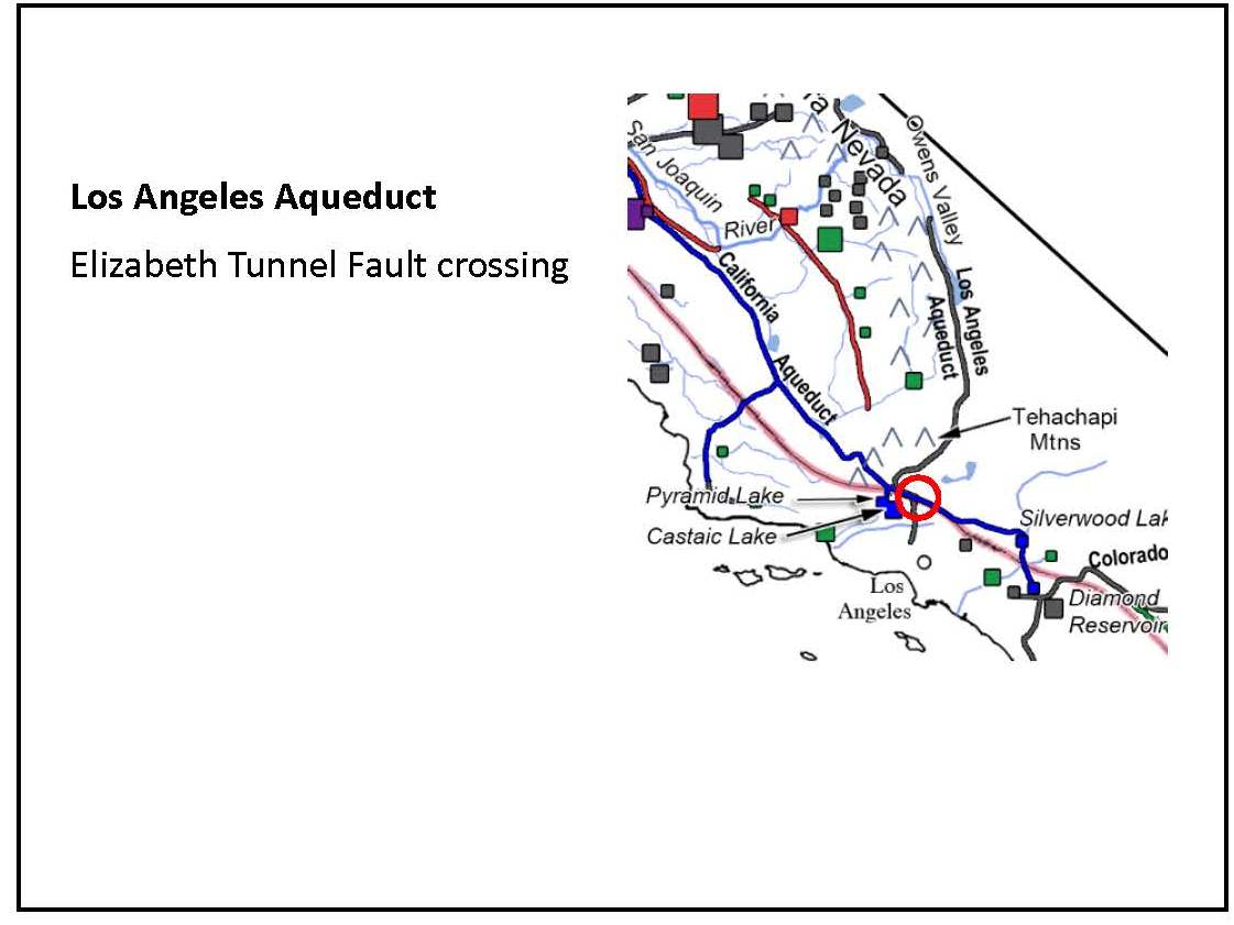 The major earthquake fault in California is the San Andreas fault, and he noted that each of the three water systems crosses the fault line at some point. The Los Angeles Aqueduct crosses at a place called Elizabeth Lake; the tunnel underneath it is called Elizabeth tunnel.