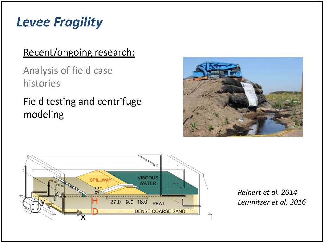 “It’s the whole relationship there as we go from we’re good to we’re bad, that’s called a fragility curve, and engineers want to be able to understand that relationship,” he said. “In this case, we would be talking about what is the probability that the levee has enough deformation that it doesn’t retain the water anymore and it flows over the top? So we and others are doing work to characterize things like that.”