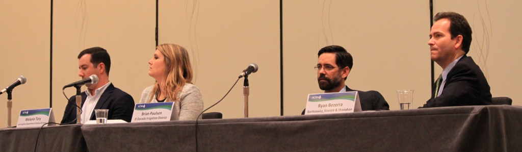“Conservation mandates pose some pretty unique legal issues,” he said. “Whether it’s SBX7-7, the emergency conservation regulations, or the discussion that’s currently happening in the legislature over proposals for enforceable long-term permanent annual urban water use objectives, these are the essential legal issues that our panel will be exploring in detail today. Melanie Tory will be talking about the relationship of conservation mandates to the reasonable use requirements of the California Constitution. Brian Poulsen is going to be exploring potential takings issues associated with the emerging framework, and Ryan Bezerra will be talking about whether conservation mandates pose potential impairments to contracts and infringements of charter city authorities.”
