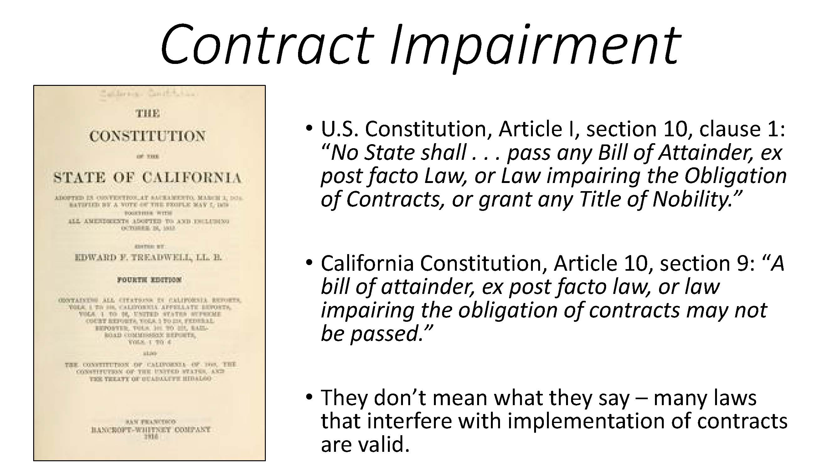 “If you have contract obligations, you’re supposed to obey contract obligations and they are supposed to be legally binding versus states retaining their police power authority to regulate in the public interest,” he said. “Both of those things on their own, you’re not supposed to mess with, but when they run into each other, it’s very messy. That’s when you get what attorneys call balancing tests, which is never the most satisfactory kind of law. It doesn’t give you many black and white rules as to what will happen, but basically that’s the balancing you have in contract impairment cases.”