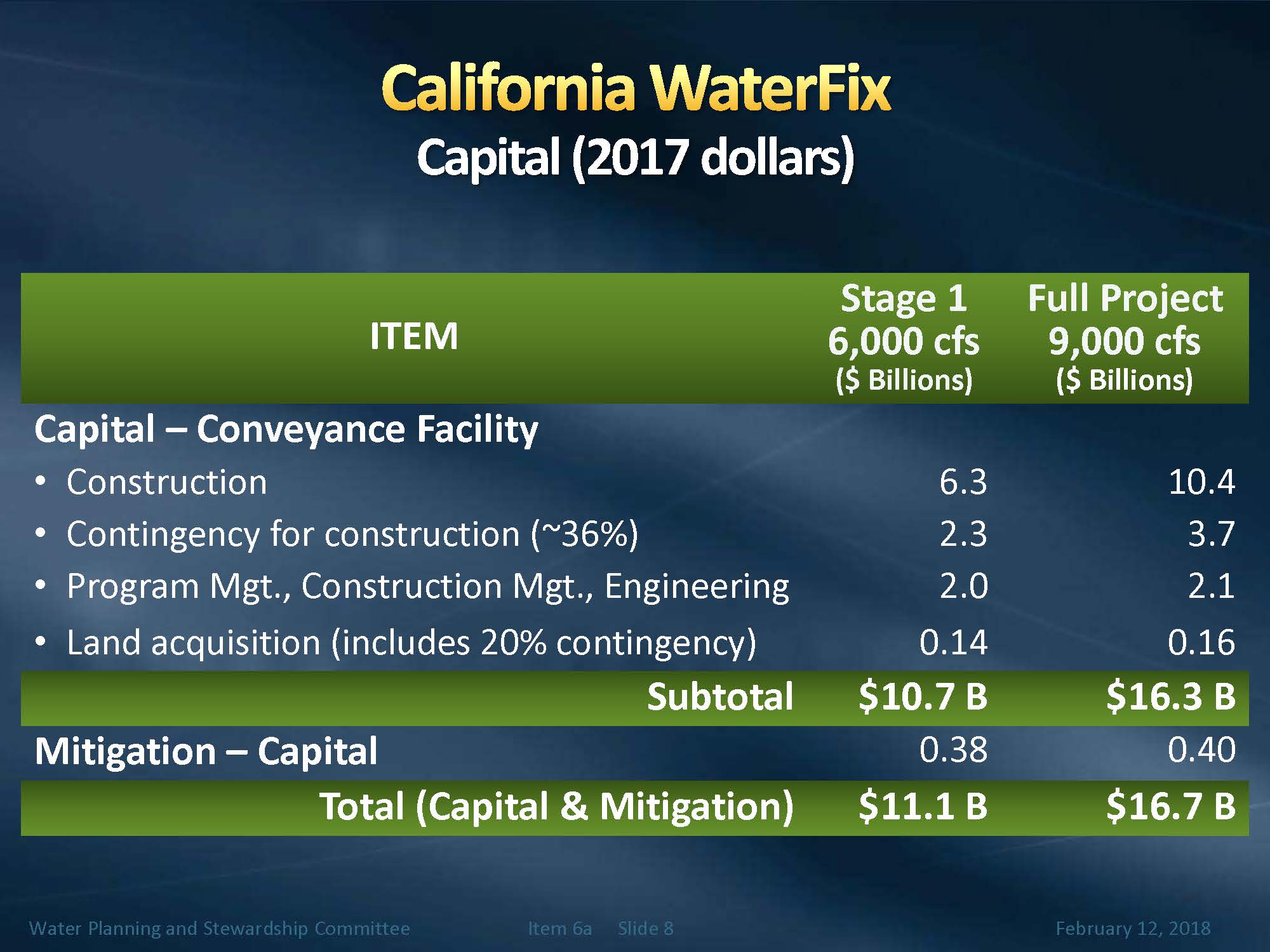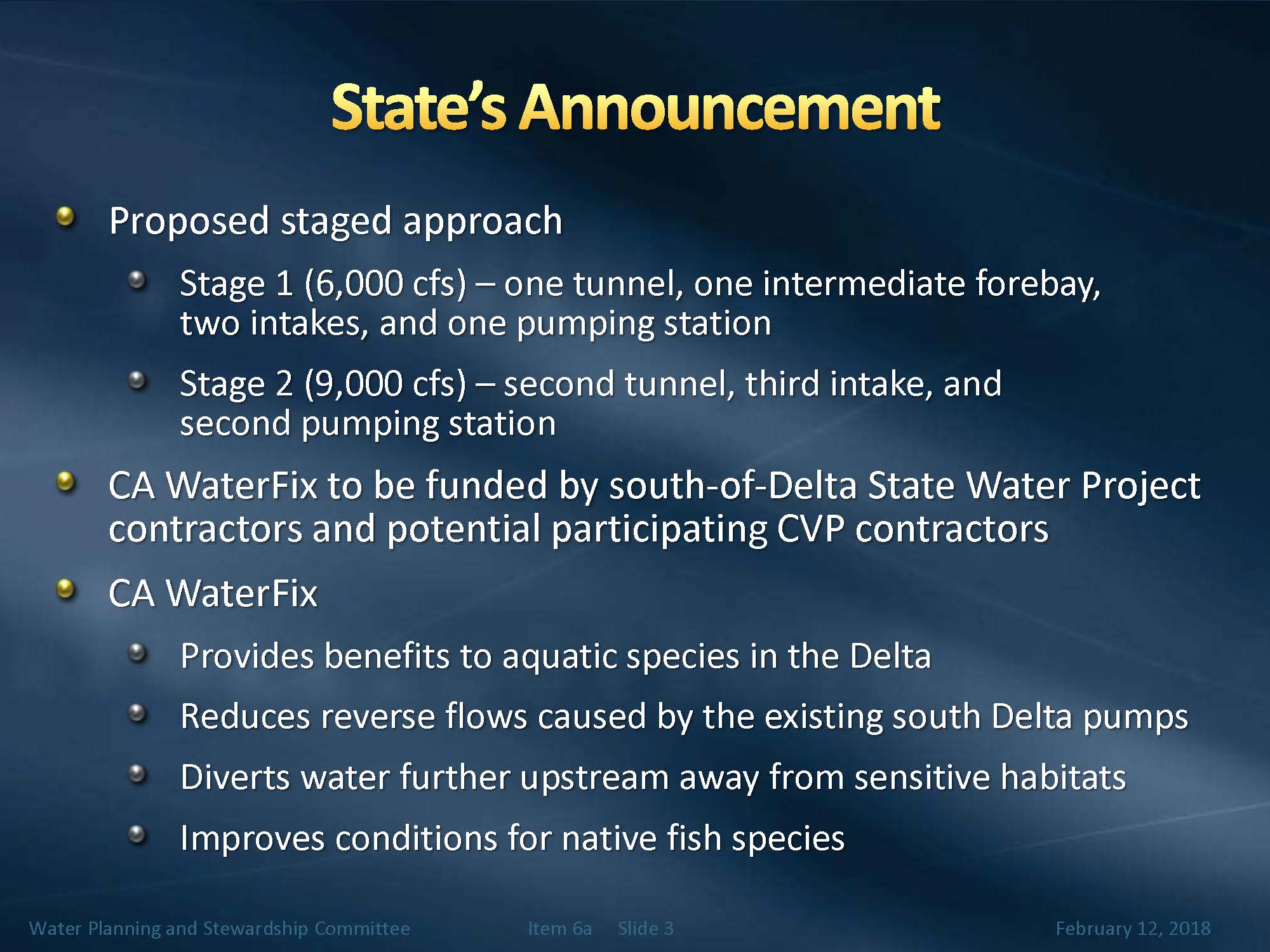 In the February 7 announcement, Mr. Arakawa said the state is really communicating that it would be pursuing Cal Water Fix as planned, which is the 9,000 cfs capacity at the intakes; the state also said that in addition, they want to be prepared to take actions that are responsive to the stated needs of the contracting water agencies, so they are looking at aligning how the funding commitments may fall into place along with project implementation. They are preparing themselves to look at staging of the project, and if all funding commitments fall into line to support 9,000 cfs, they would move forward with that; if not, they would have a plan with how they would move forward with stage one, he said.