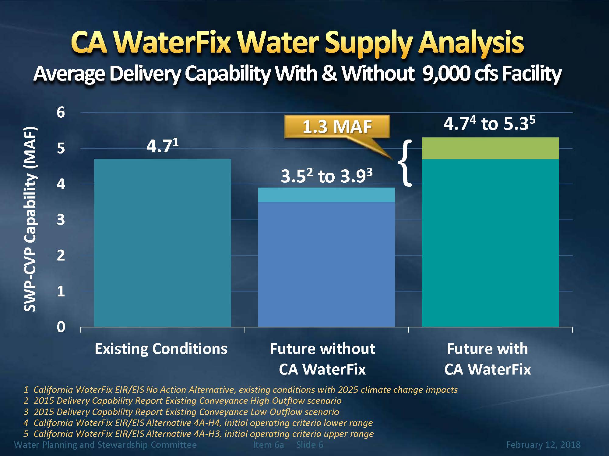 Mr. Arakawa next presented a slide showing their analysis of the full Cal Water Fix project. Currently, the State Water Project and the Central Valley Project provide 4.7 MAF of water supply on average. The analysis of what the SWP and the CVP would provide if anticipated regulations were implemented without the new intakes had a range of 3.5 to 3.9 MAF, which would be a reduction.