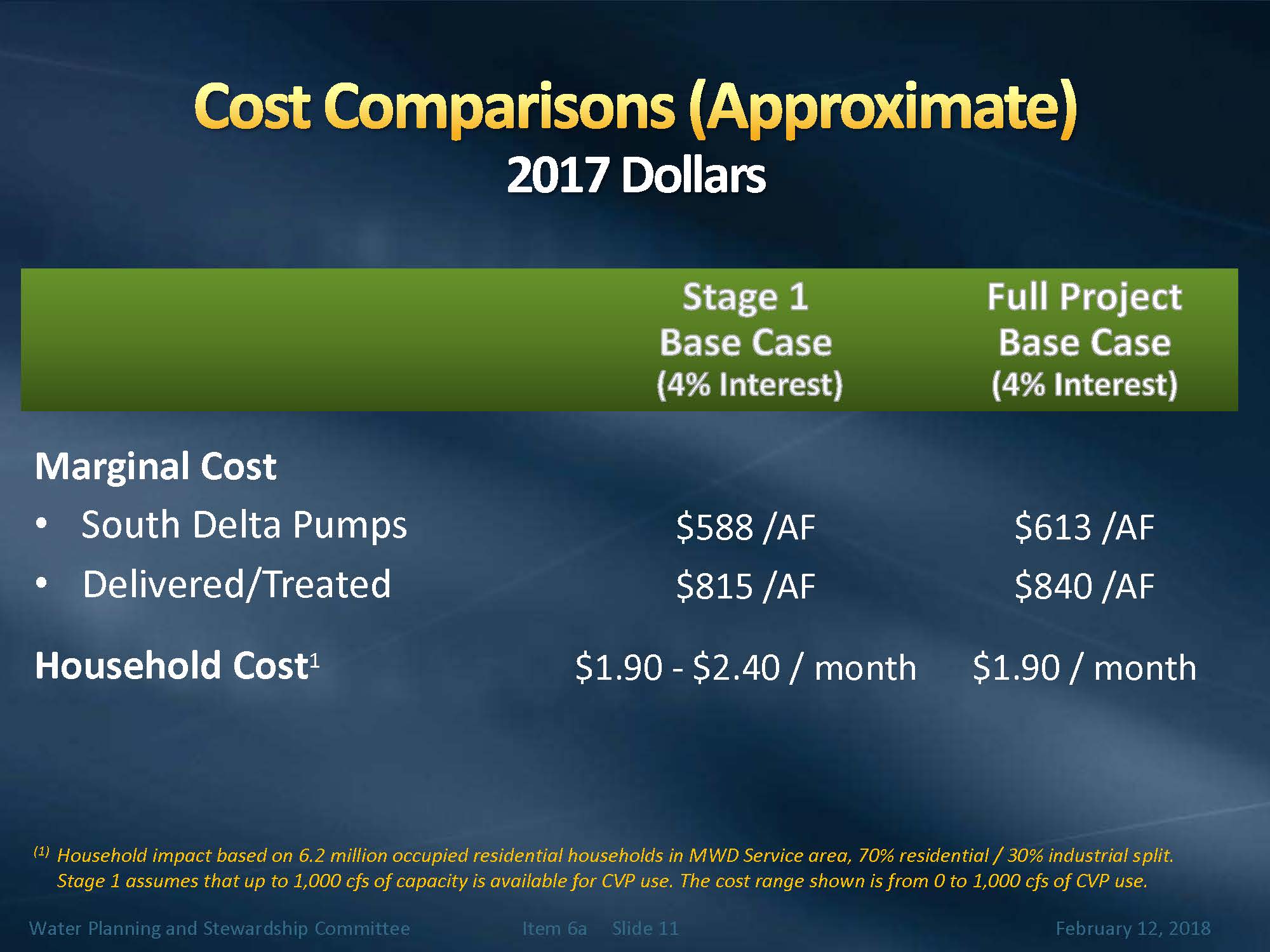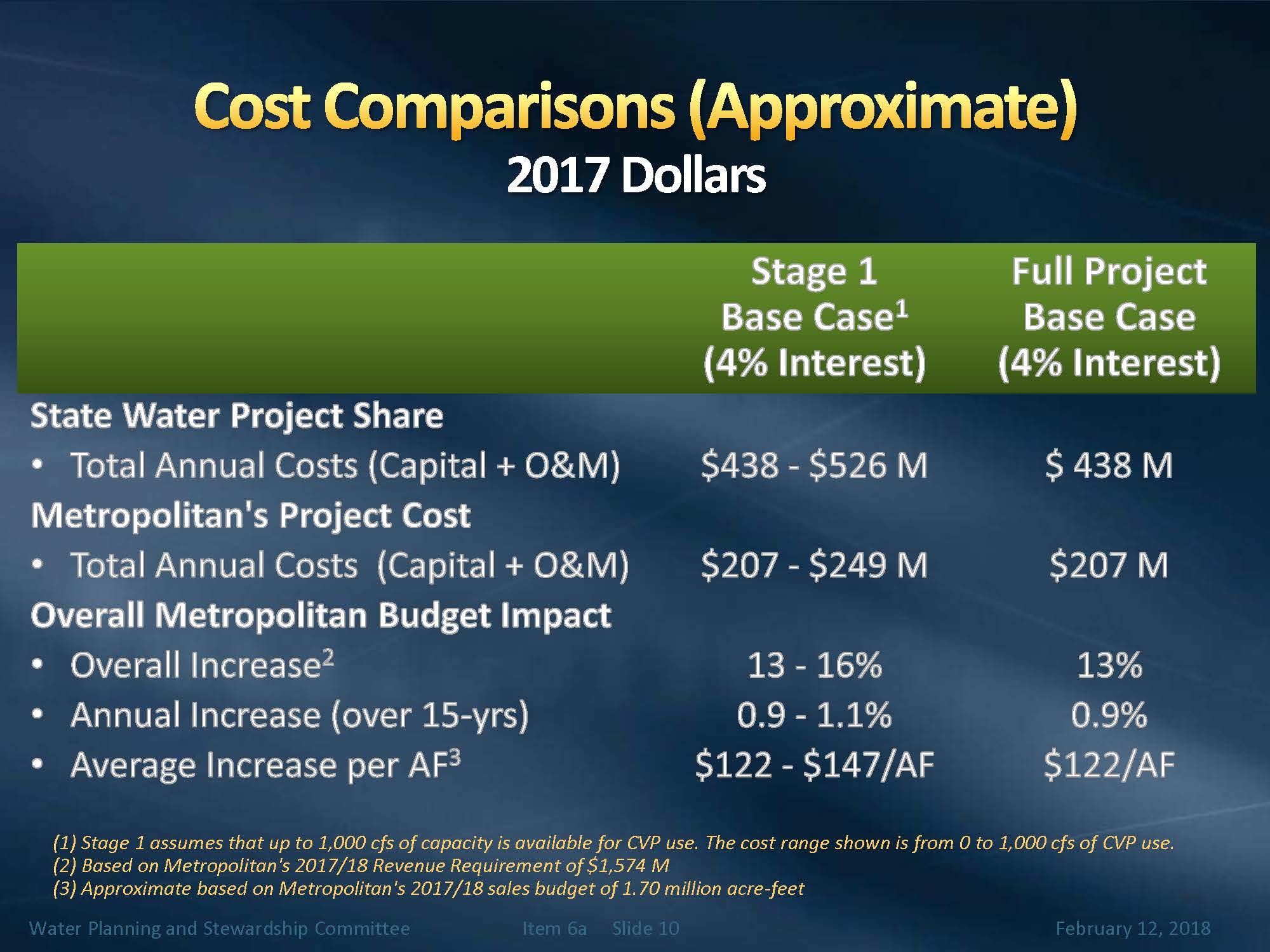 “The average increase per acre foot when you consider the sales of Metropolitan water, assuming 1.7 MAF of sales based on the 2017-18 sales budget, is $122 per acre-foot if you melded the costs into all of the water that Metropolitan sells. Similarly for stage one, it would be the range, depending on the share the State Water Project takes in the 6000 cfs stage one.”