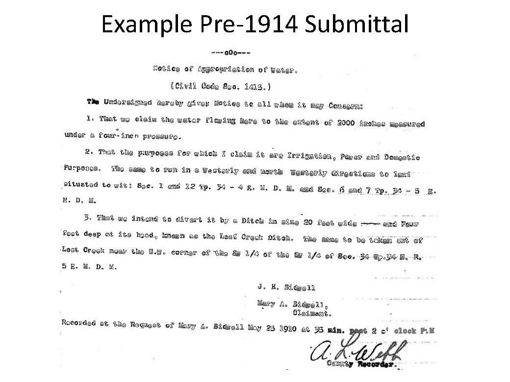 al Order sought “a copy of [the] notice [of appropriation] filed with the county, copy of property deed and all other information…pertaining to initial diversion and continued beneficial use of water. Mr. Ekdahl then presented some examples of materials that were submitted, noting many historical documents were received with some documents extending well back into the 1800s.