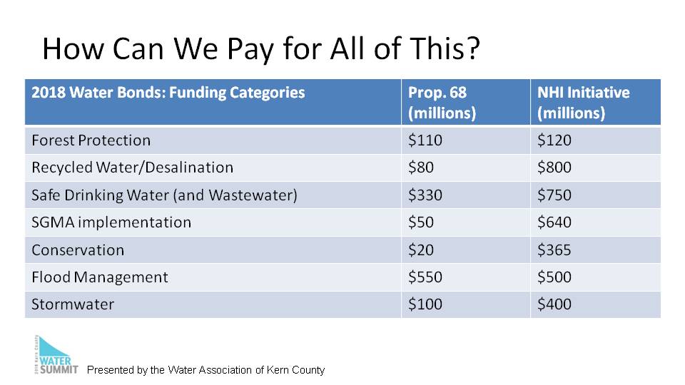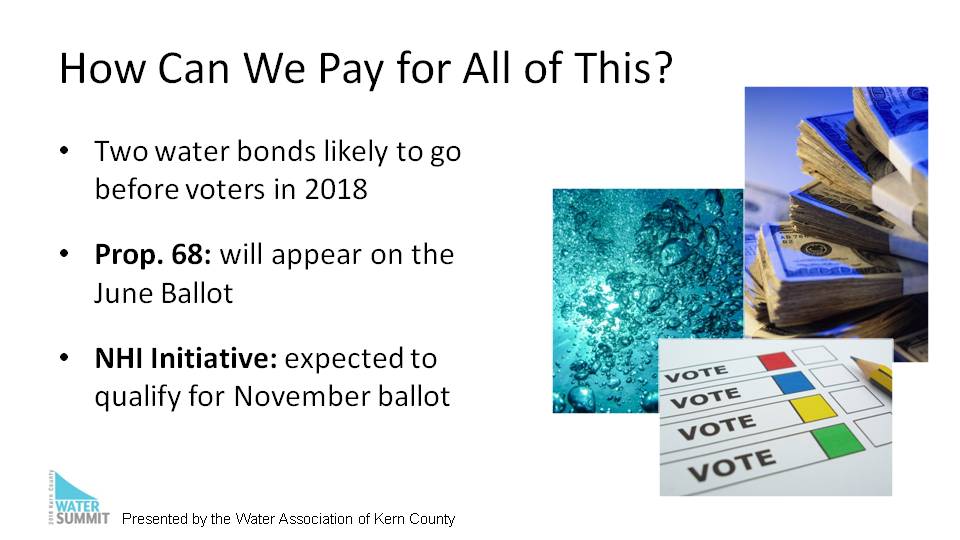 There are two bonds headed for the ballot, Proposition 68 in June and another backed by National Heritage Institute and Jerry Meral that is expected to quality for the November ballot. The ACWA Board of Directors supports both of the bonds, noting that the bond that will likely be on the November ballot has funding to help with SGMA implementation and subsidence in the Central Valley.