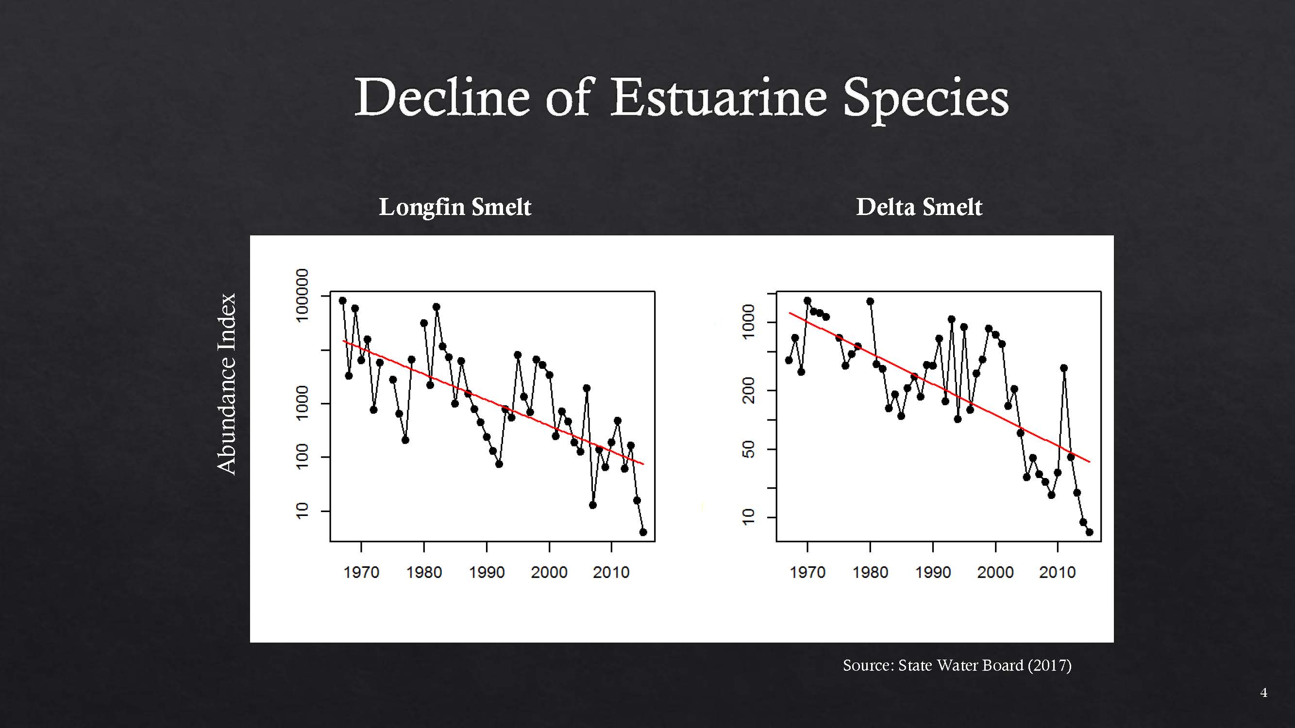 Mr. Oppenheimer presented a slide showing the abundance of the longfin smelt and the Delta smelt (lower, left), noting that abundance is represented on the vertical axis, and time is represented on the horizontal axis. “It’s pretty apparent from the data dating back to the 1970s to current time and that both the species are in a pretty significant downward decline; the trajectory is not great,” he said. “If you look at the mid 90s when the last plan was adopted, things haven’t improved since then.”