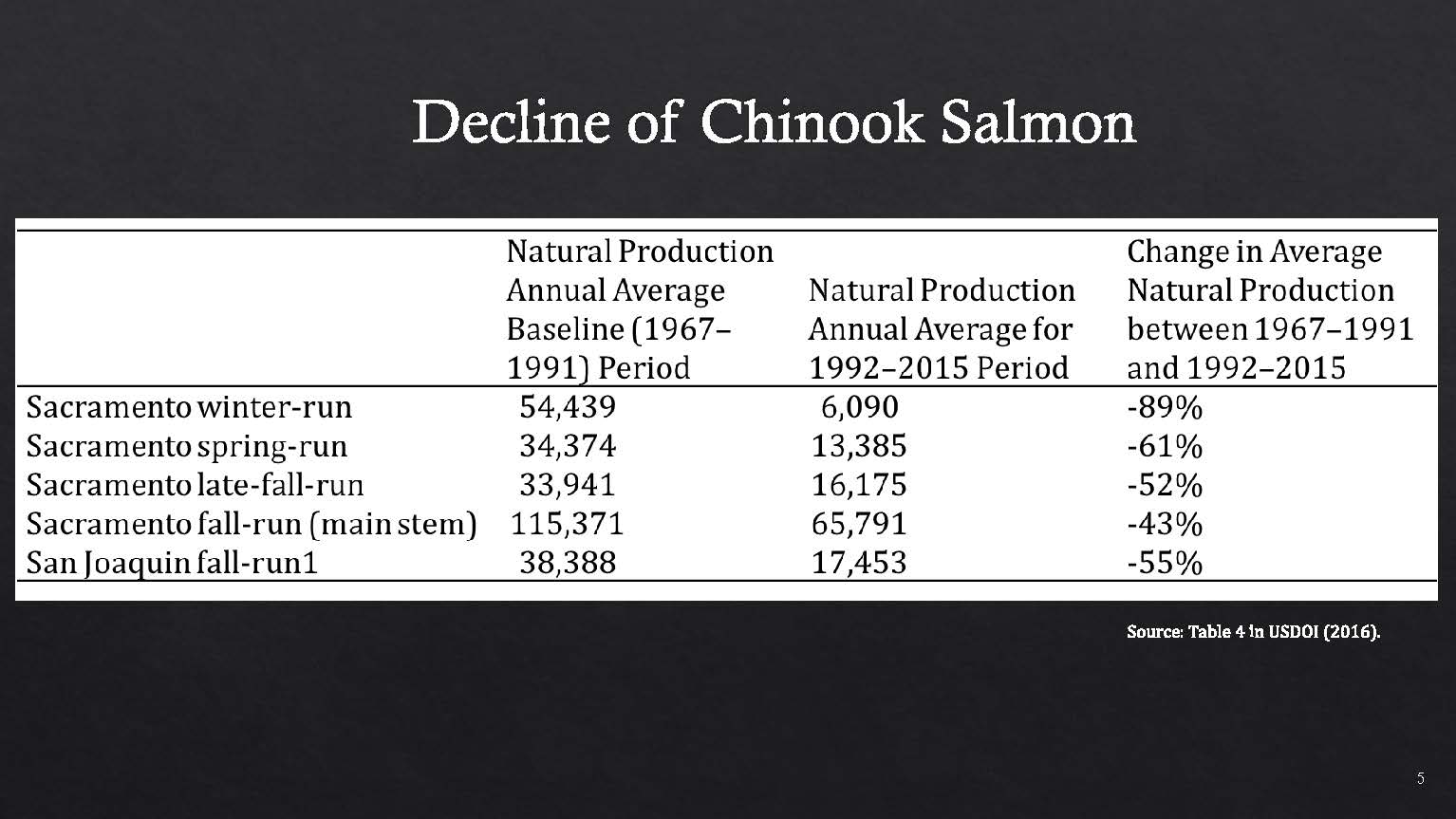 He noted the situation is not any better for salmon, presenting a table of data from the anadromous fish restoration program from the Department of Interior (above, right). The table shows the data for four different runs of Sacramento chinook and San Joaquin fall run chinook salmon; the first column is the baseline period from 1967 to 1991; and the second column the period of 1992 to 2015. “Basically what the data show are again significant declines, probably most notably Sacramento winter run,” he said. “We see an 89% decline from the baseline period to the more current period.”