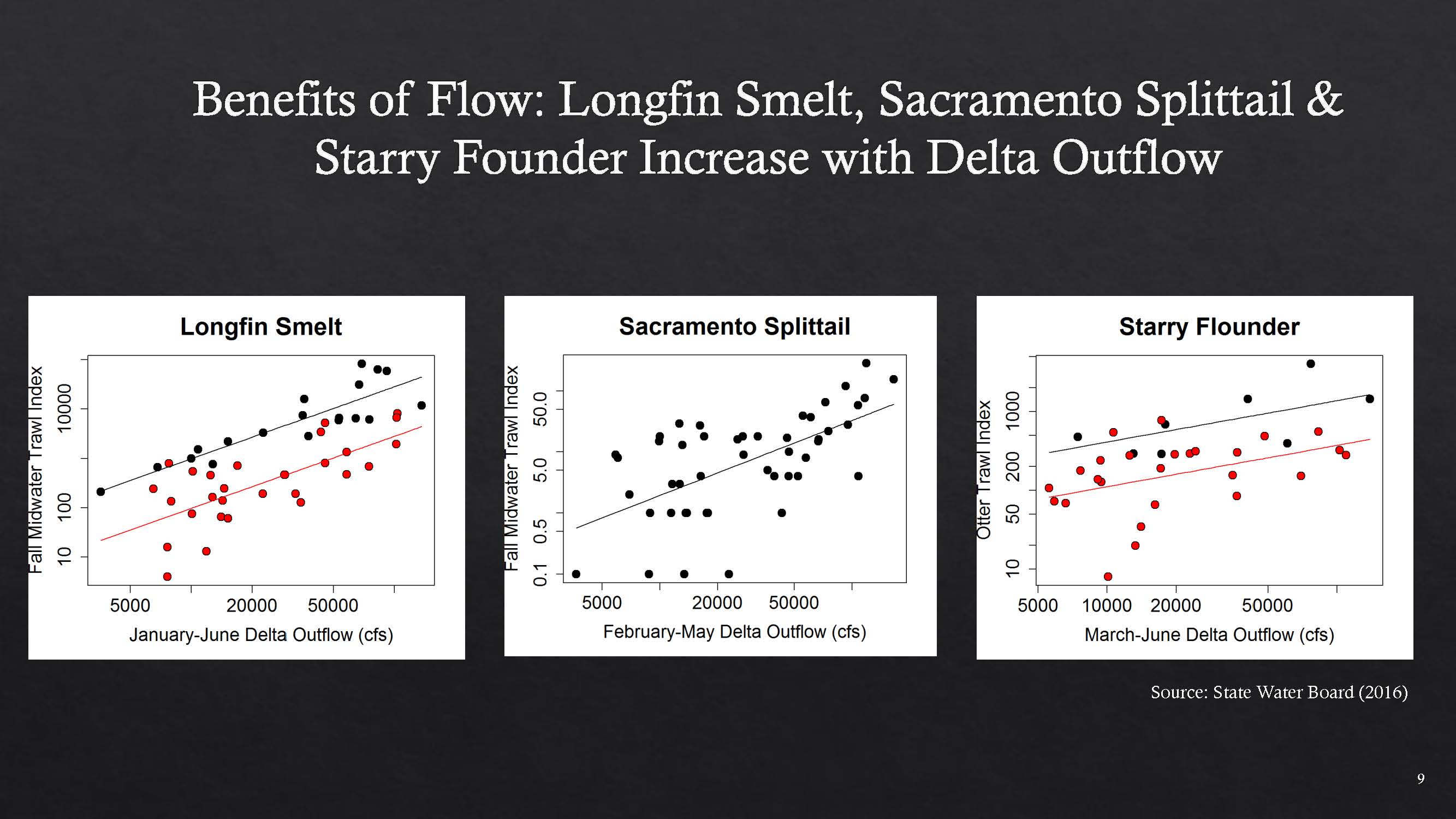 He noted that the situation is similar for Delta centric species such as longfin smelt, splittail, and starry flounder (upper, right). “For each of them we see that as flow goes up, abundance increases.”