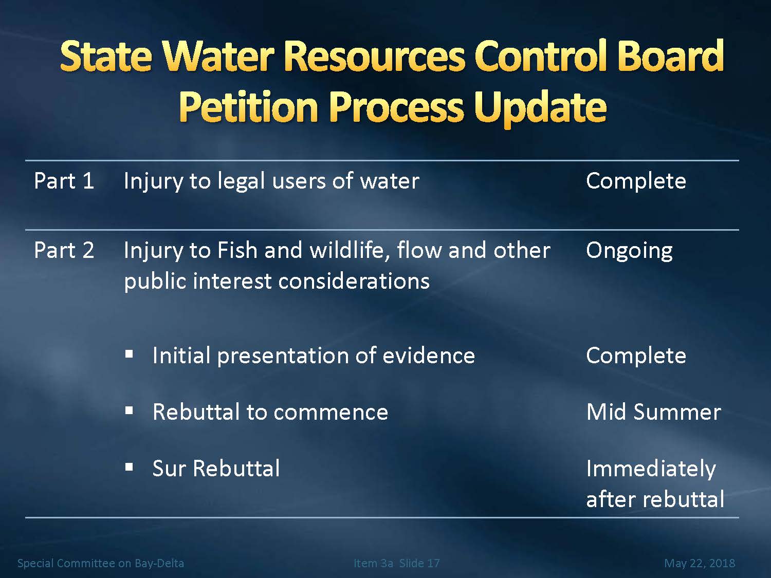 The hearing at the State Water Board for the change petition is ongoing. The hearing began in July of 2016. The hearing has two parts: Part 1, which looked at the potential impacts or injuries to other legal water users, was completed in 2017. Part 2 began in February of 2018, and looks at the potential impacts and injury to fish and wildlife, and other public interest aspects; it is still ongoing. All of the direct testimony and cross examination of parties has been completed; they are currently waiting for the State Water Board to indicate a process for the rebuttal.