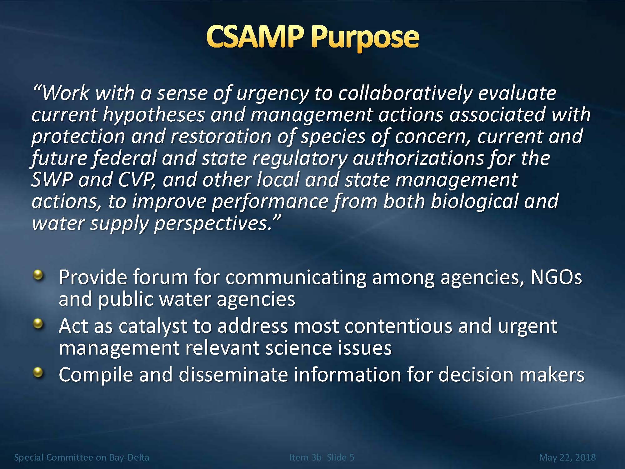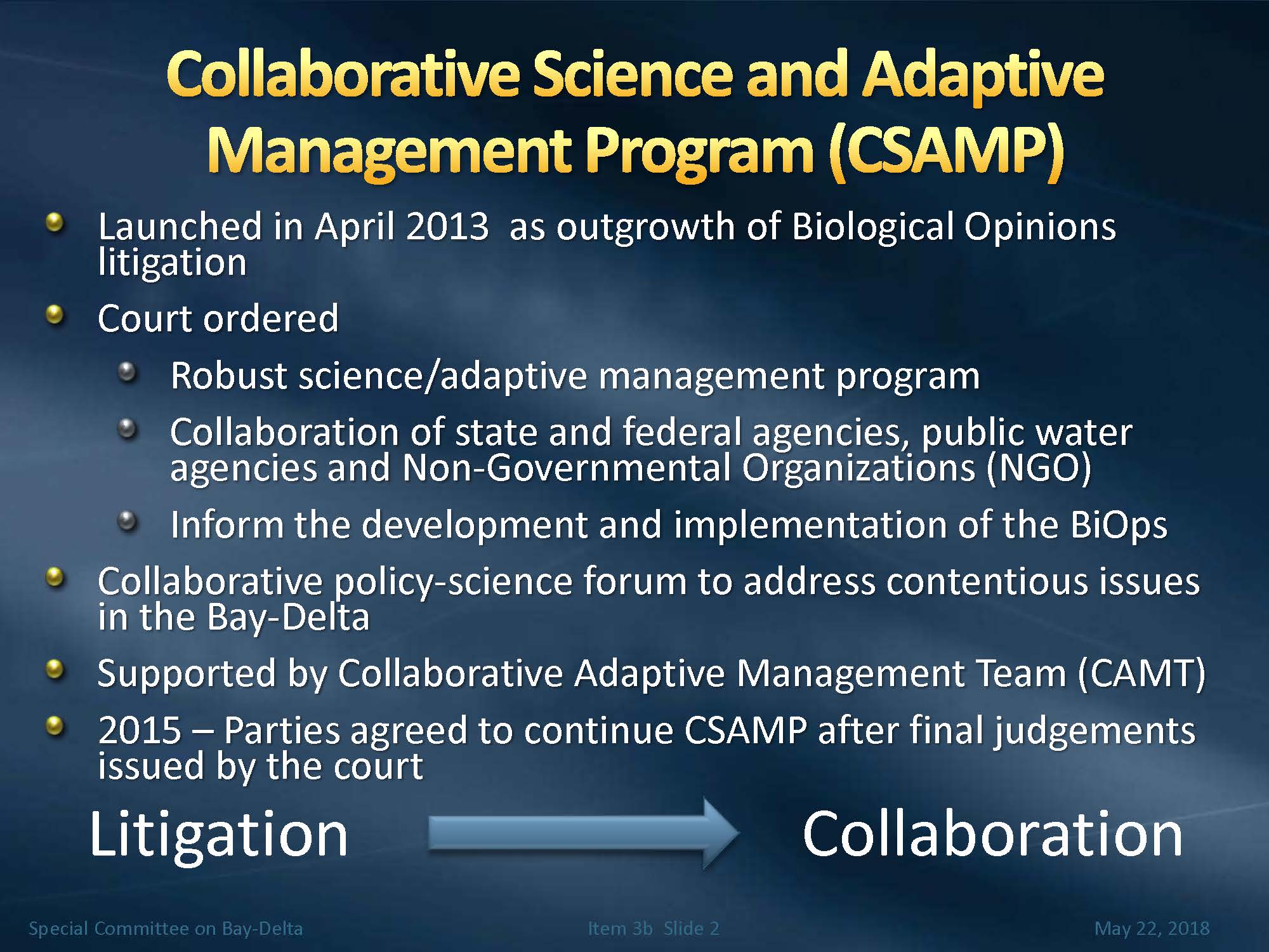 - Collaborative Science and Adaptive Management Program: The Collaborative Science and Adaptive Management Program is an important science forum. The Collaborative Adaptive Management Team is the senior scientist manager level team that works to implement the vision that the CSAMP policy group directs. The CAMT has a number of science efforts underway, such as analysis of data and fish surveys, synthesizing data to find answers and to determine science gaps, and structured decision making.