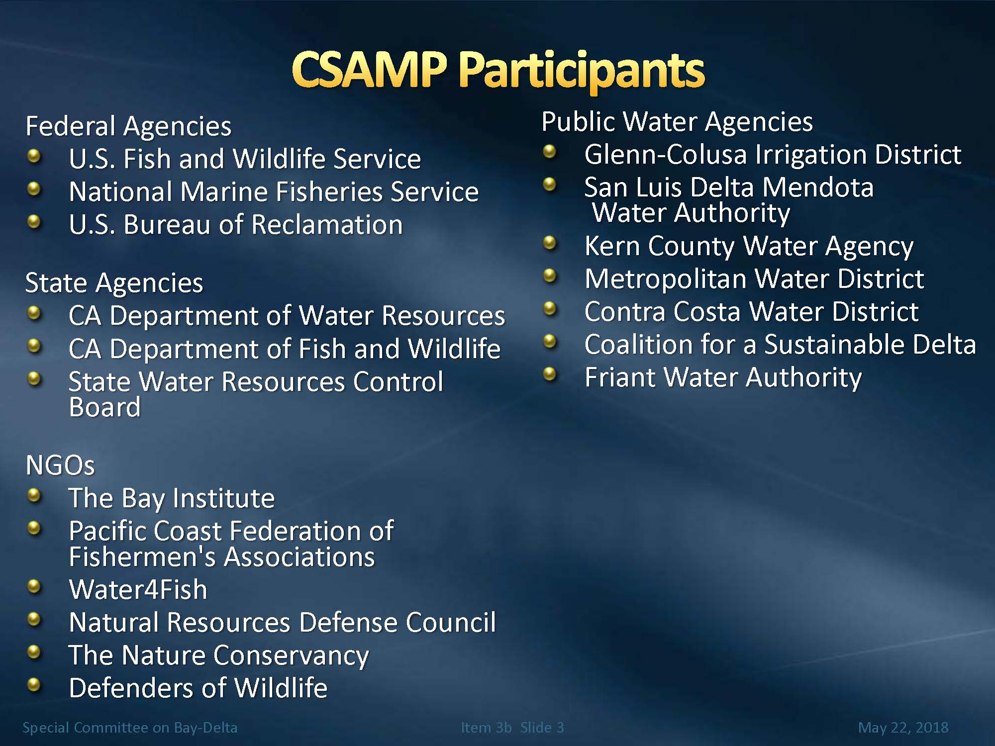 The Collaborative Science and Adaptive Management participants include the Bureau of Reclamation, the National Marine Fisheries Service, the US Fish and Wildlife Service, the Department of Water Resources, the State Water Board, Department of Fish and Wildlife, a number of NGOs and environmental interests as well as public water agencies, of which Metropolitan is a participant.