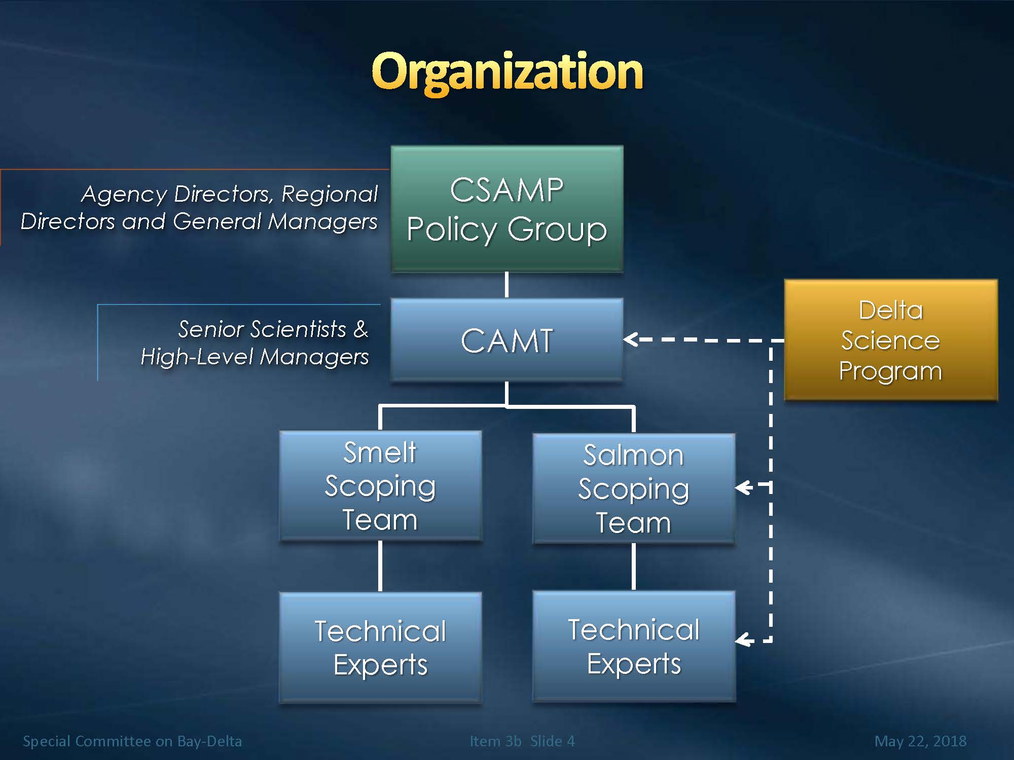 The Collaborative Adaptive Management Team is below the policy group; it is comprised of high level science managers and from the different agencies. Below the CAMT, there are a number of teams below that that deal with salmon, or smelt, or other types of technical areas of focus. The Delta Stewardship Council’s Delta Science Program provides support to the collaborative nature of improving the science through peer review and other studies that they may take on.