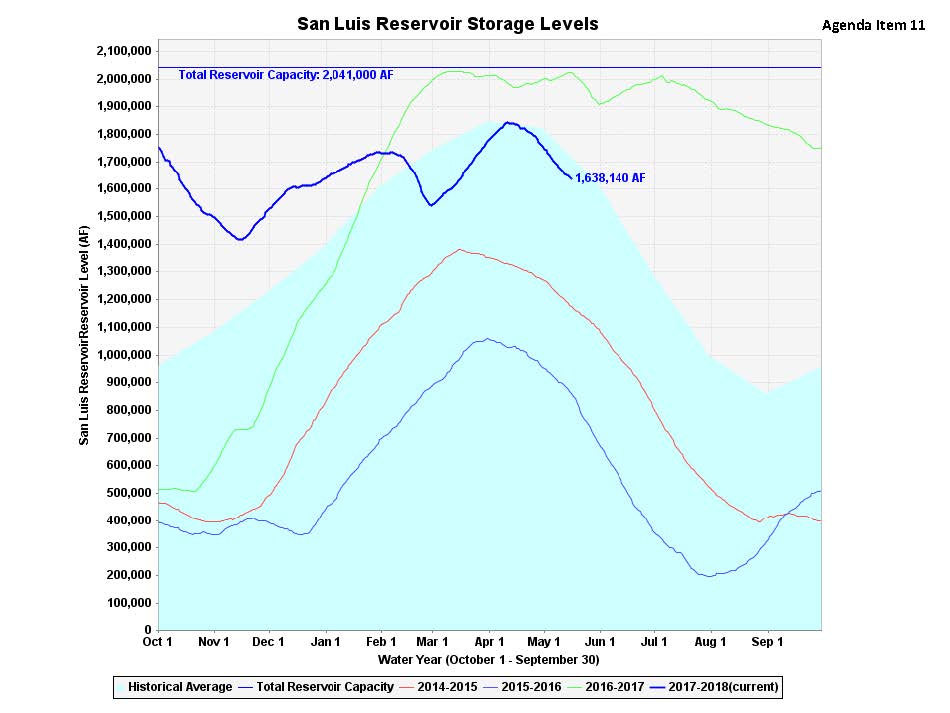 Reservoir levels at San Luis are doing fairly well; it’s much closer to average for this time of year, he said. He pointed out the dip in February. “That’s rather remarkable; it indicates how dry the winter was in February,” he said. “You don’t typically see that even in those driest years where we’re actually having to draft storage out of San Luis in order to meet the deliveries in the middle of the winter, but that’s how dry it was this winter until we did get the March precipitation.”