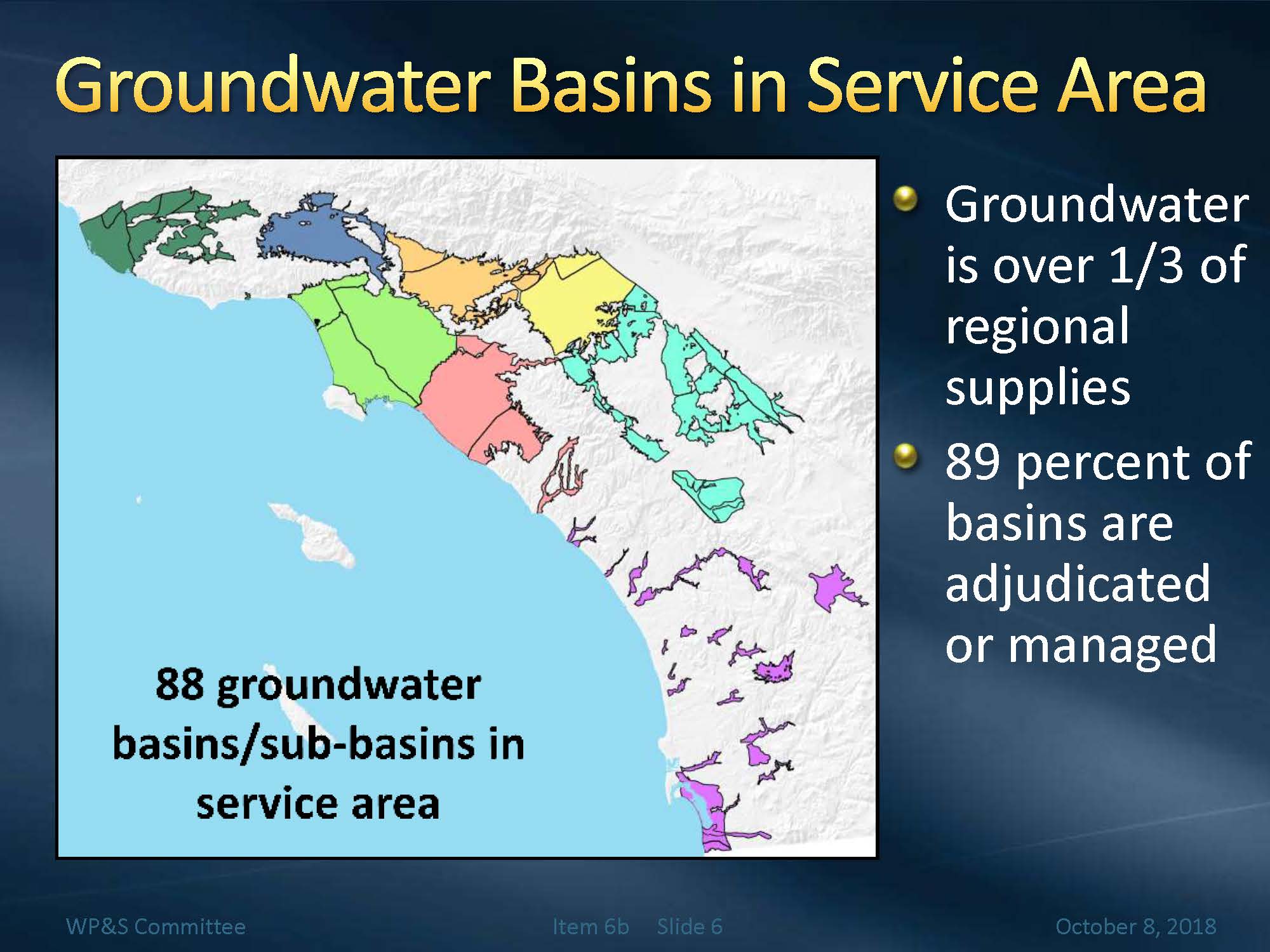 There are 88 groundwater basins and subbasins within the Metropolitan service area. Groundwater provides over 1/3rd of the region’s water supplies. 89% of the basins within the Metropolitan service area either are adjudicated or managed.