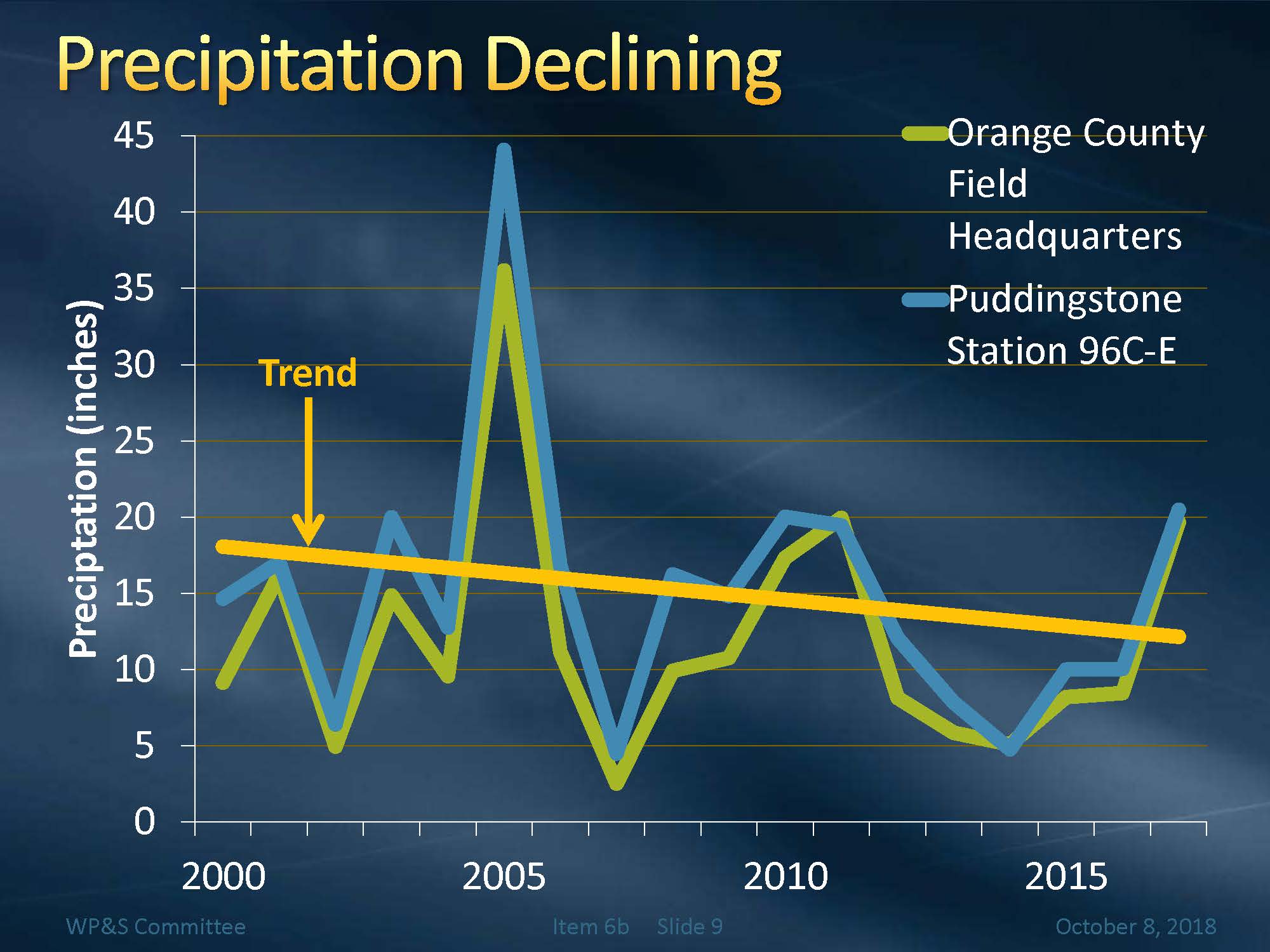Mr. Hacker presented a graph with precipitation data from two stations, one in the Orange County Basin and the other in the Main San Gabriel Basin. The highest precipitation was in 2005 at 35 to 40 inches; 2011 was a wetter year with just over 20 inches in rainfall; and in 2017, there was just over 20 inches.