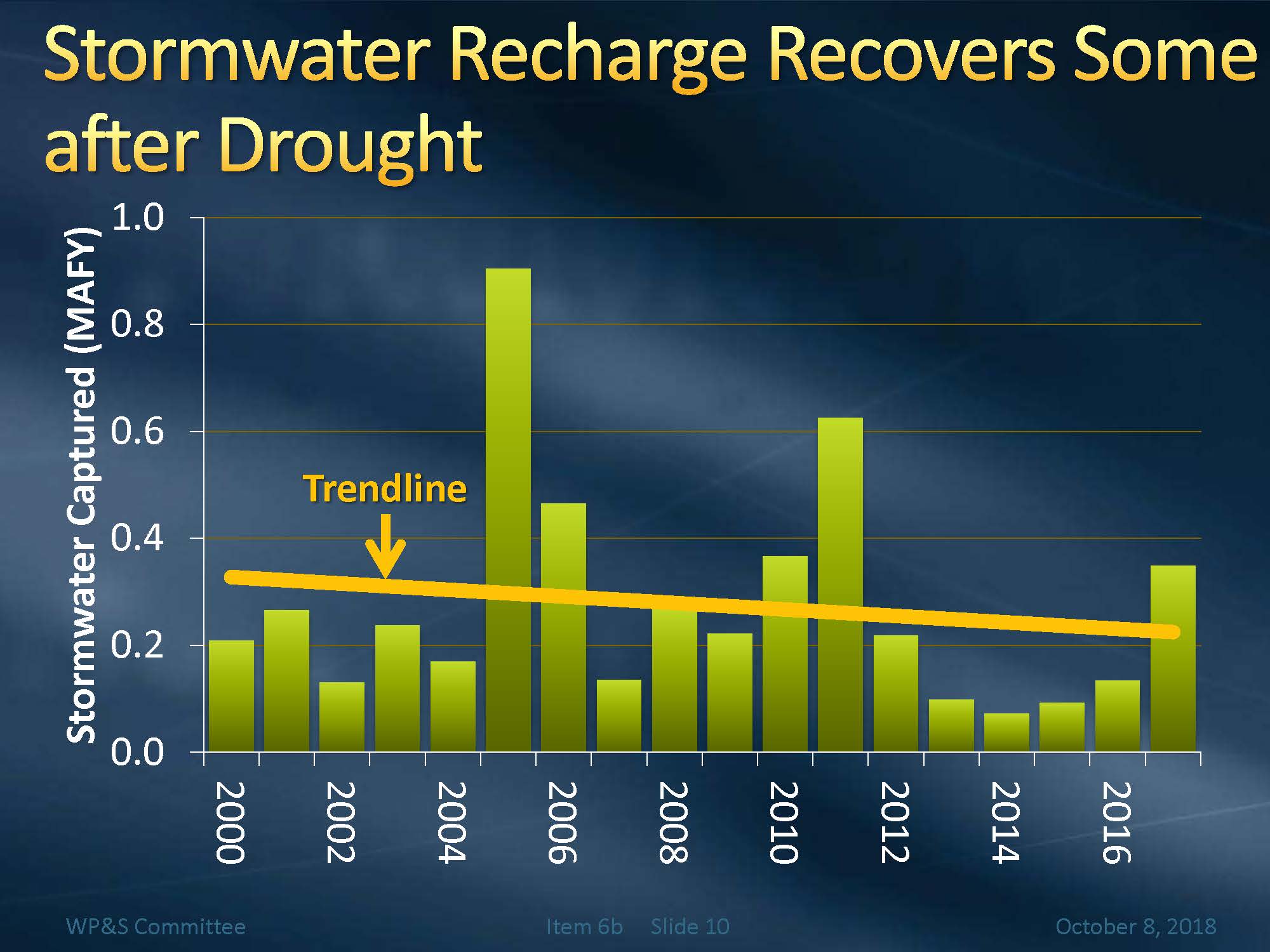 Mr. Hacker next presented a slide showing stormwater recharge, noting that it is similar to the precipitation numbers. He pointed out that 2005 was the high at about 900,000 acre-feet; however, in 2011 with the 20” of rainfall, there was 600,000 acre-feet of recharge and in 2017, with the same amount of 20” of rainfall, there was only 400,000 acre-feet of stormwater recharge. He explained that it had been dry for many years so a lot of the water was consumed in the watershed area, so not as much came down to our spreading grounds.