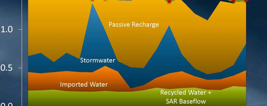 He then presented a chart showing groundwater recharge from all different sources, noting that recharge has been declining since 2000. The green on the bottom is the recycled water and Santa Ana River baseflow; it has generally increased a little bit. The orange is imported water which can be quite variable; he noted that recently, some of the basins are recharging more water in 2017 and beginning of 2018. The shaded blue area represents stormwater.