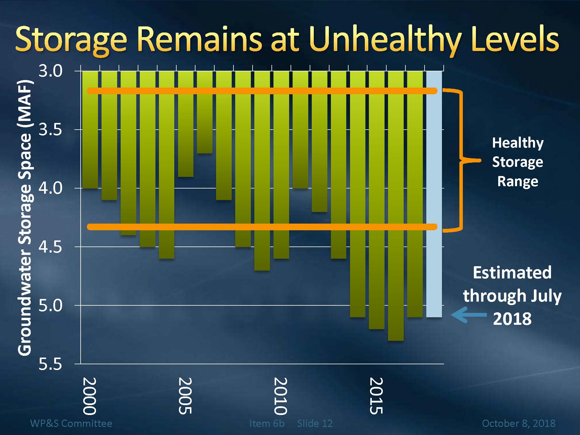 He then presented a slide showing overall storage, noting that it’s an upside down chart on purpose. “The idea is that this is meant to mimic what groundwater levels are doing, so as the chart goes downward, so do groundwater levels,” he said. “The healthy storage range here is shown in the orange, so it goes from about 3.2 to 4.3 MAF of storage which is the area the groundwater basins are targeting. As you can see in this chart, for the last four or five years, we’ve been actually quite a bit below that, so we have actually lost about 1.1 MAF of storage since 2000, and 1.4 MAF since 2005. That’s not a good situation that we really want to be in for the region.”