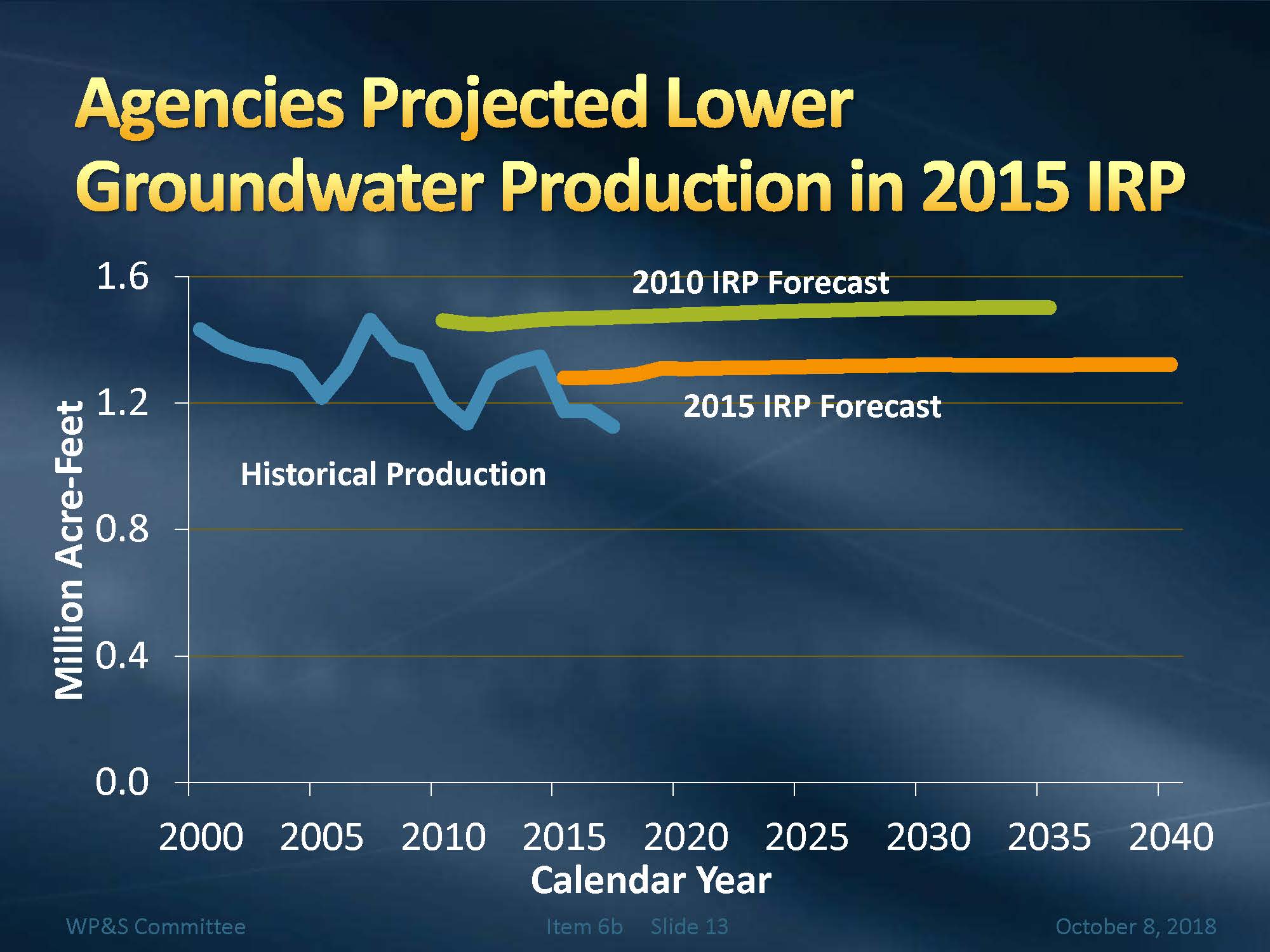 The next slide compared historical production to the forecasts in the IRP. Historical production within the Metropolitan service area has declined from about 1.4 to 1.1 MAF between 2000 and 2017, a drop of about 25%. The 2010 and 2015 IRP targets are shown, and the 2017 actual amounts are a bit lower than that.