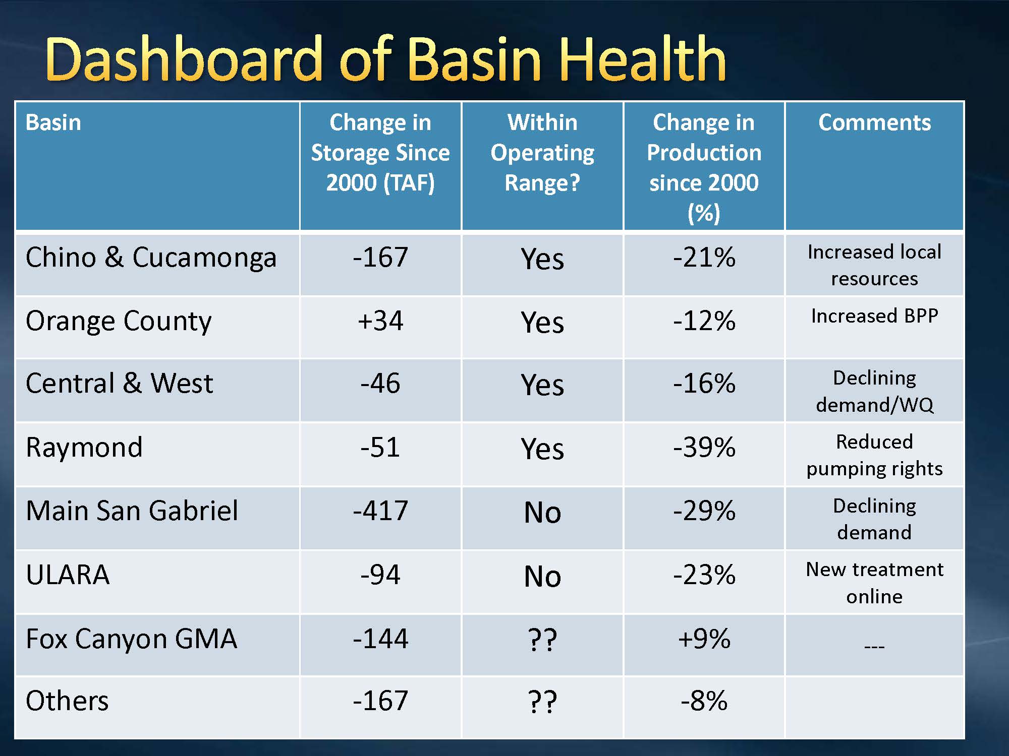 Mr. Hacker then presented a table showing data from some of the individual basins. Looking at the change of storage since 2000, most of the basins have been declining, some more than others. Most of the basins are still within their operating range, although some portions of them may not be. Orange County actually went up a bit and has been pretty much the same since 2000. Main San Gabriel and ULARA (or the San Fernando Basin) are actually below there operating range. He explained that the ones with the question marks on the bottom are the areas where it’s really not clear whether they are in the operating range with respect to storage or not, because there are targets for water level, but not necessarily for storage.