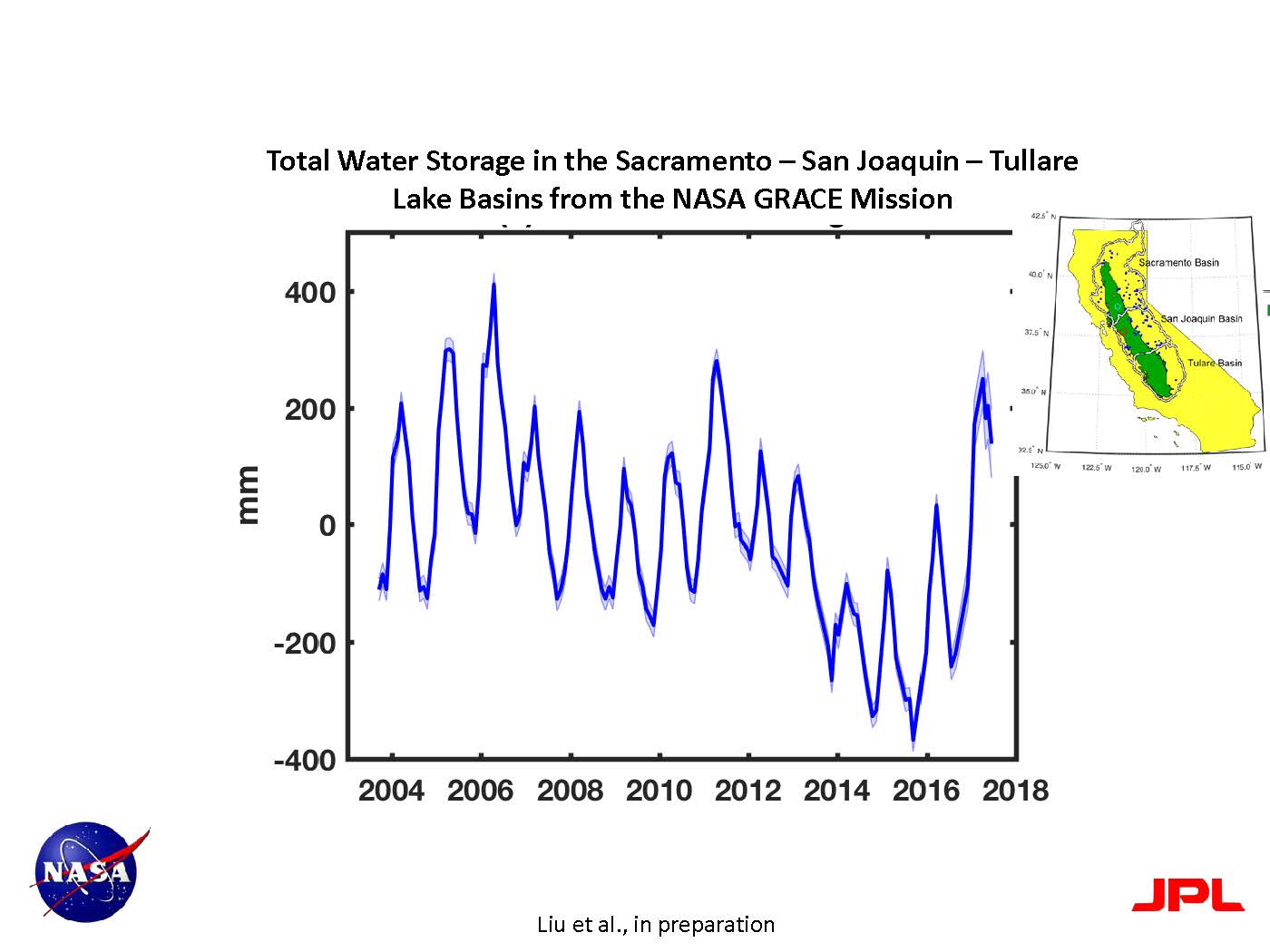 Dr. Famiglietti then turned to discuss California, presenting a figure from the NASA Gravity Recovery and Climate Experiment (or GRACE), a satellite that can measure and track storage changes of all the snow, surface water, soil moisture, and groundwater. GRACE takes monthly measurements, tracking changes in the water around the globe. He acknowledged that it’s a pretty coarse resolution and can’t really provide site-specific information, but it can help us understand what is happening in California and around the world.