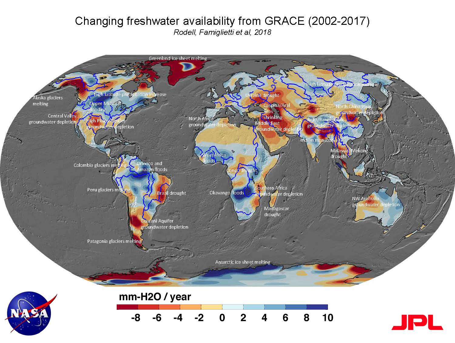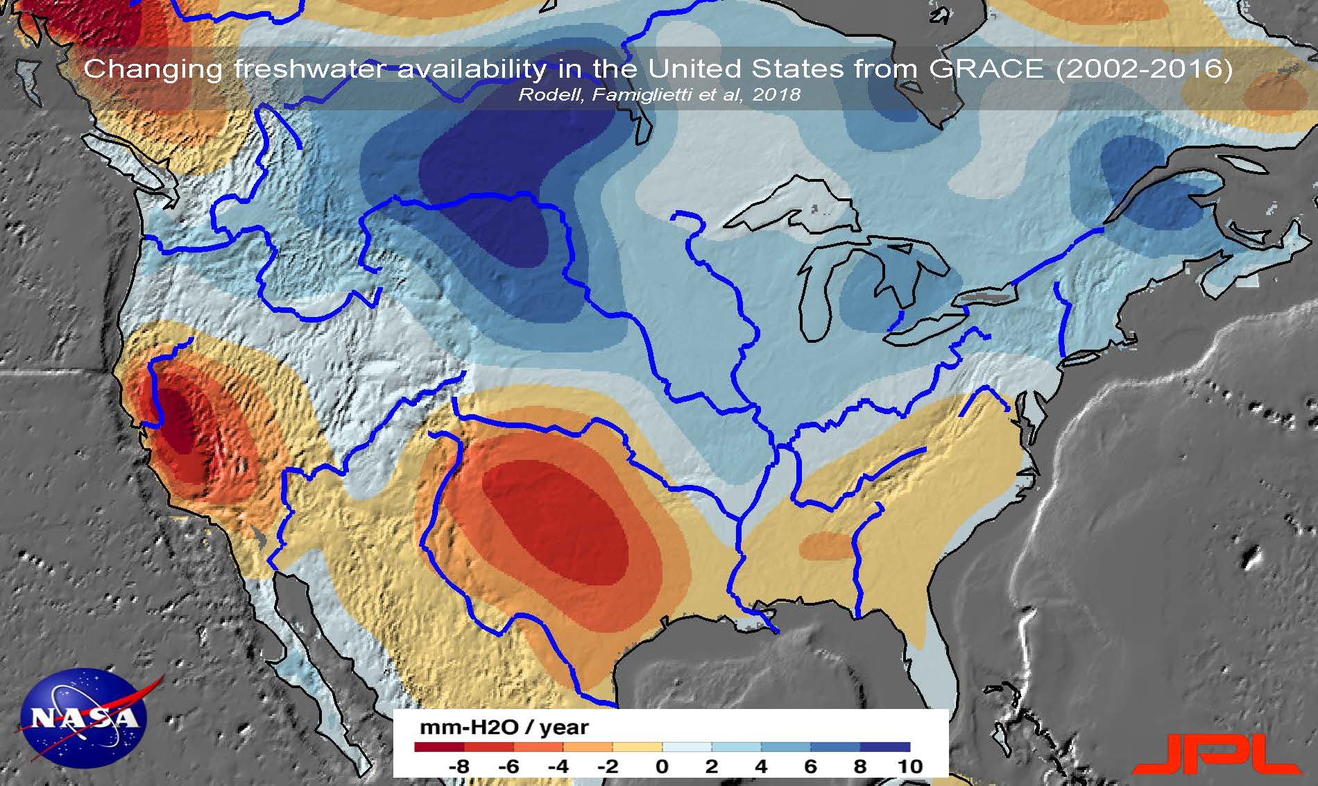 Dr. Famiglietti: “It’s hard to say that in any one location and at any one time whether something is climate change or not, but when you look at the frequency of what’s happening, there are changes in frequency of what’s happening, and it’s unlikely that some of these things would be happening without climate change. That said, I go back to this global map and there is a very big climate change component to this map. When you look across the high latitudes, those are mostly blue, they are getting wetter, and across the tropics, they are mostly blue, they are getting wetter, and in between is getting drier; that’s been predicted by the climate change models for the end of the 21st century and we’re seeing it now. It’s exacerbated in those dry areas where they are pumping groundwater because it’s dry and there’s less rainfall, so it’s exacerbating and accelerating the dry periods. Globally, very strong climate change indications.”