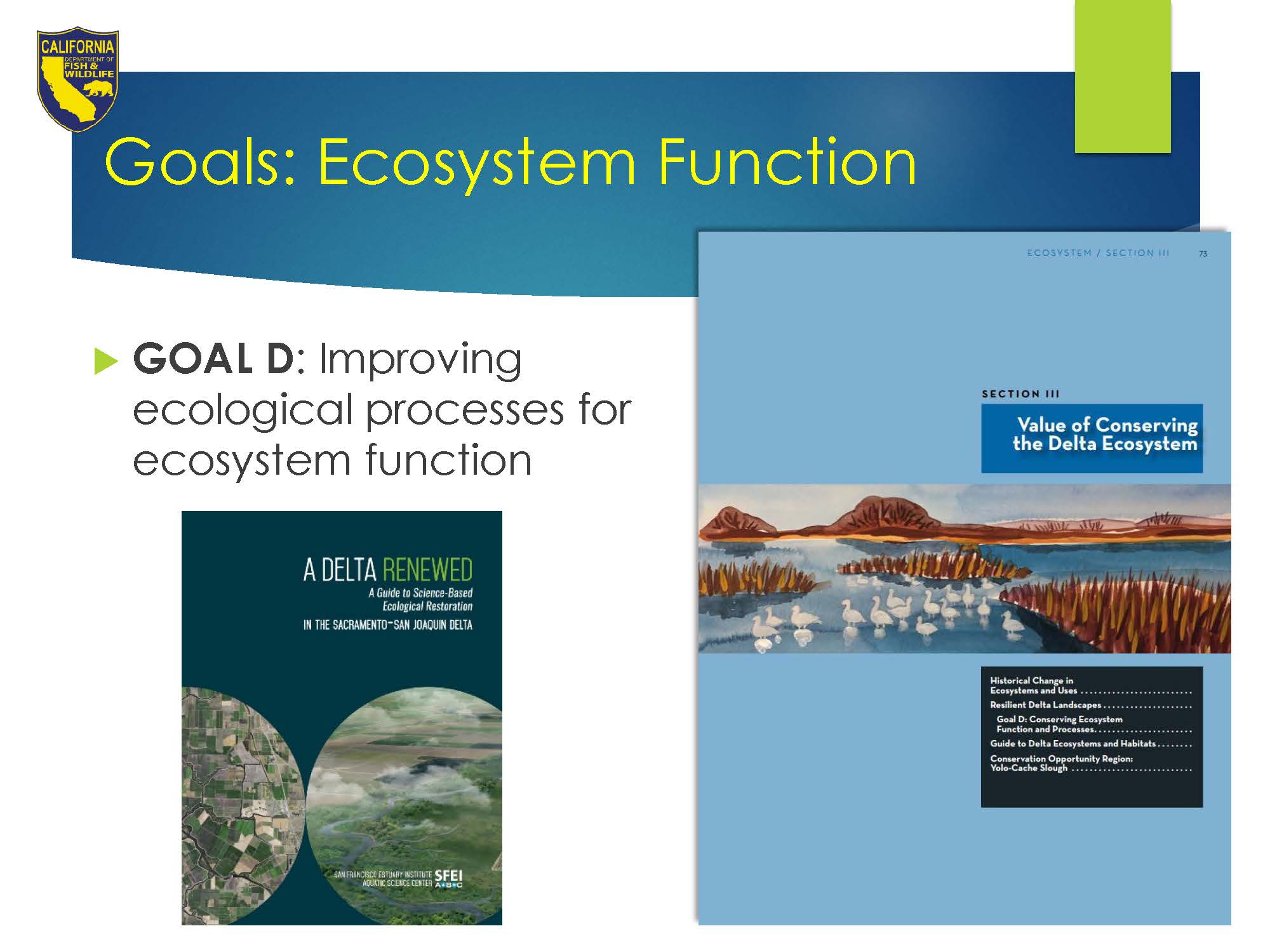 - The second main theme is ecosystem function, and goals focus on restoration to support ecosystem function. The publication, A Delta Renewed, from the San Francisco Estuary Institute is the baseline for the strategies outlined in this part of the framework.