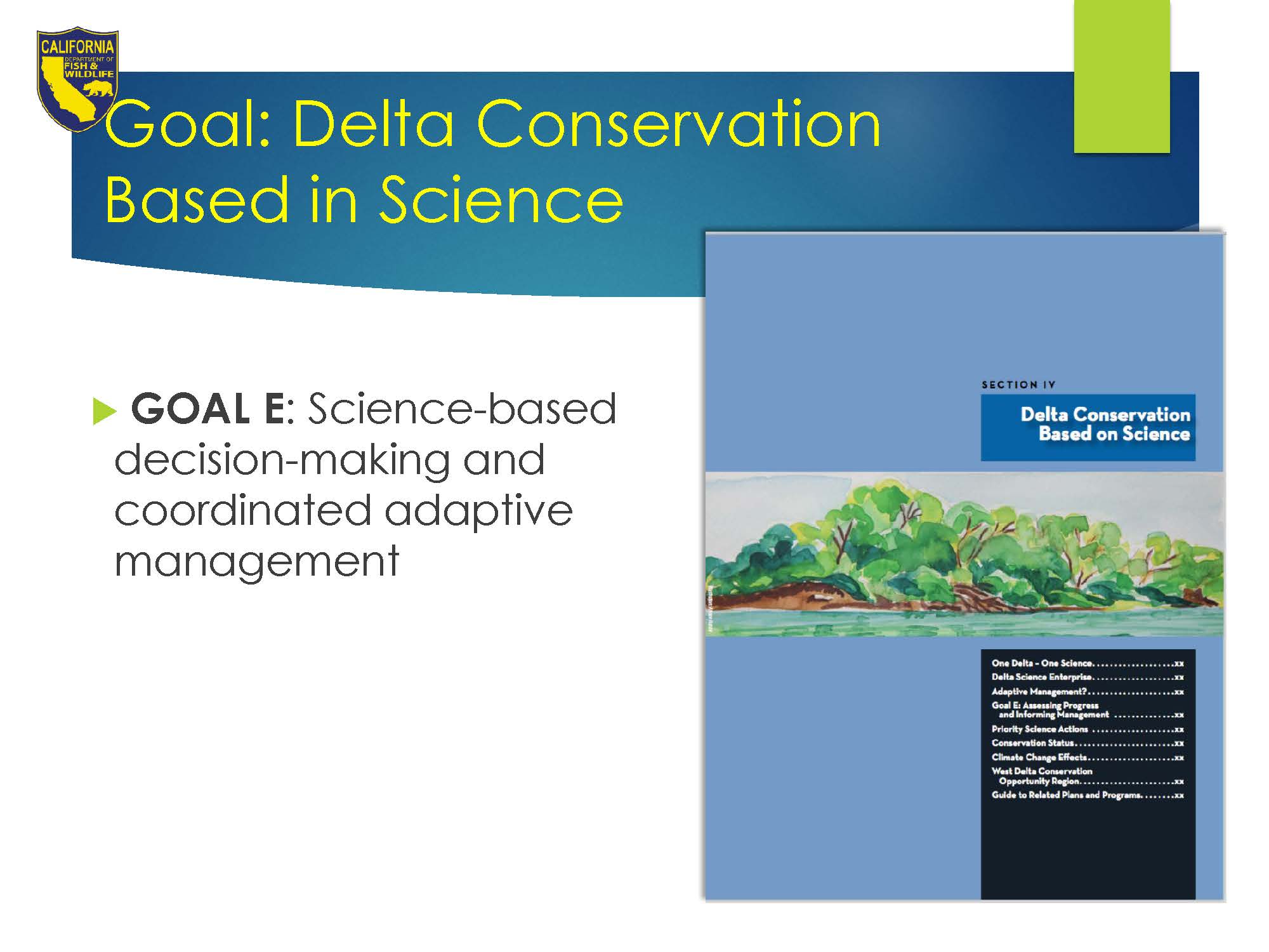 - The third theme calls for Delta conservation based in science. The goals highlight the importance of using science to inform decision making as well as coordinated adaptive management.