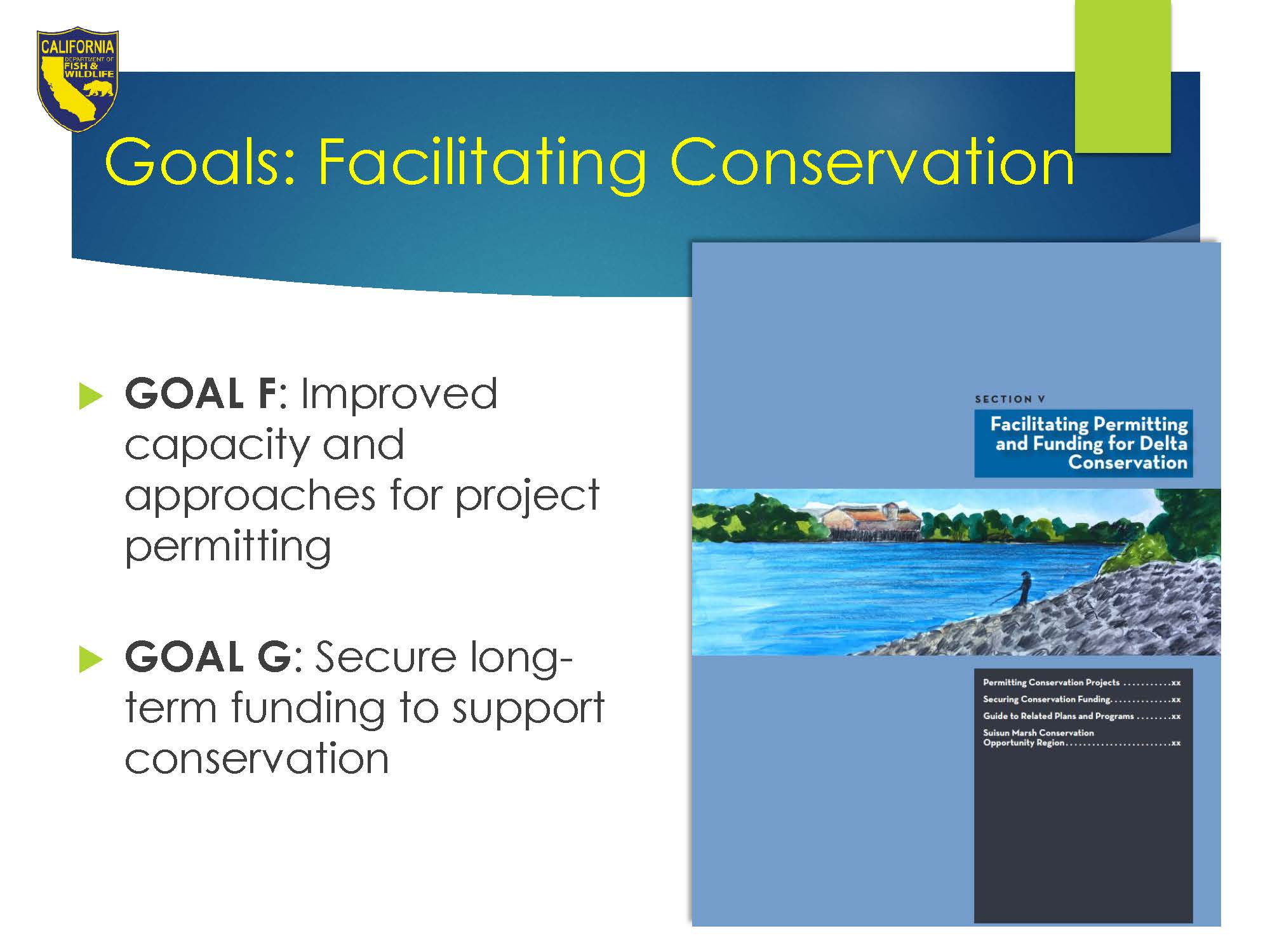 - The fourth theme is facilitating conservation. The goals for this theme include improving capacity on approaches for project permitting, and finding long-term funding to support conversation.
