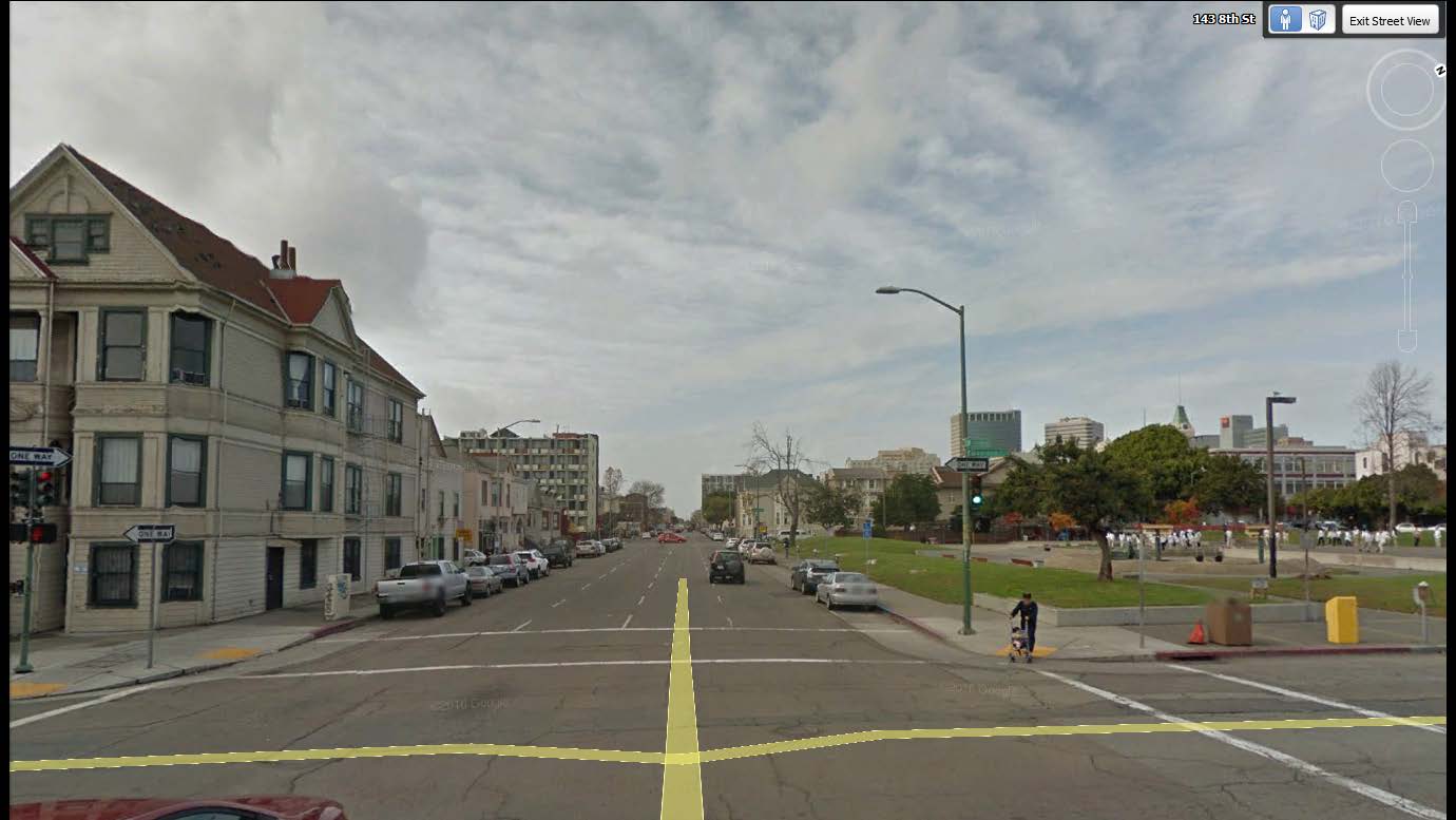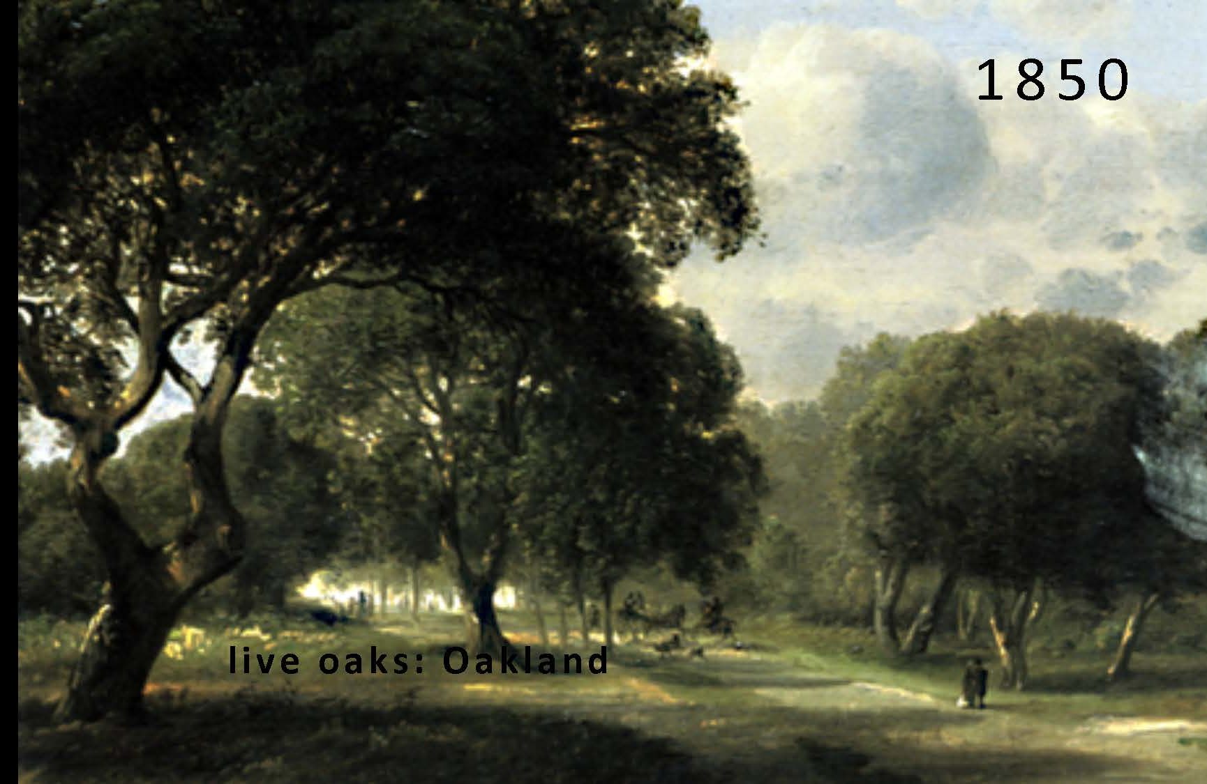 On the left, a painting of a part of Oakland in 1850, and on the right, a picture of the same place as it looks today …
