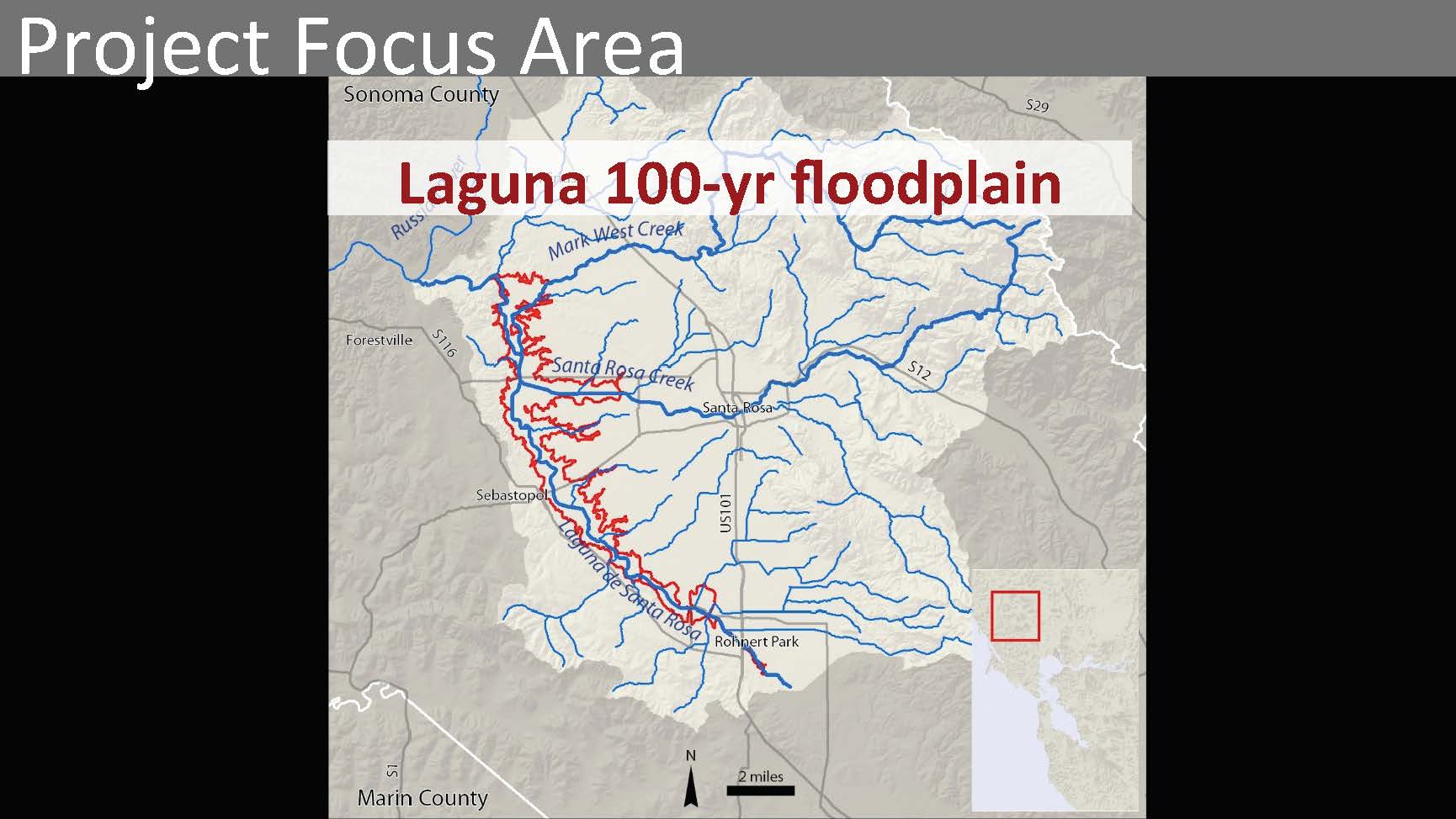 Dr. Grenier presented a map (below, left) of the Laguna de Santa Rosa in Sonoma County; the red line denotes the 100-year floodplain. In this area, several creeks come together, and there are flooding issues as well as several TMDLs for water quality.