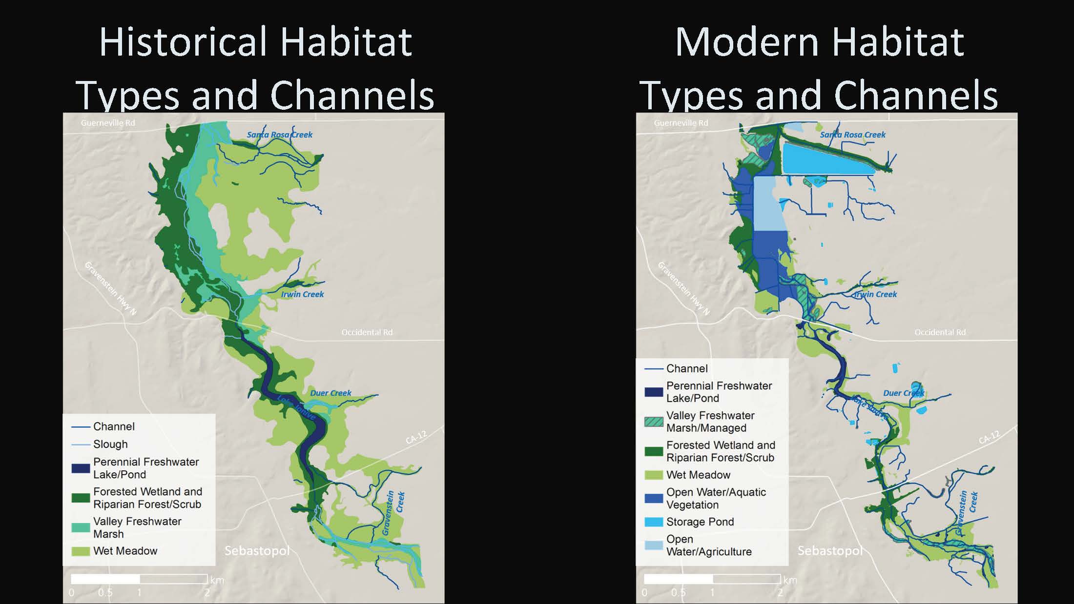 A comparison of historical to modern wetlands and channel types (above, left) shows the typical loss and fragmentation of habitat types. “We can see that we have some ecosystem service problems and ecological problems, and this project is designed to think of how to solve them at the same time,” she said.