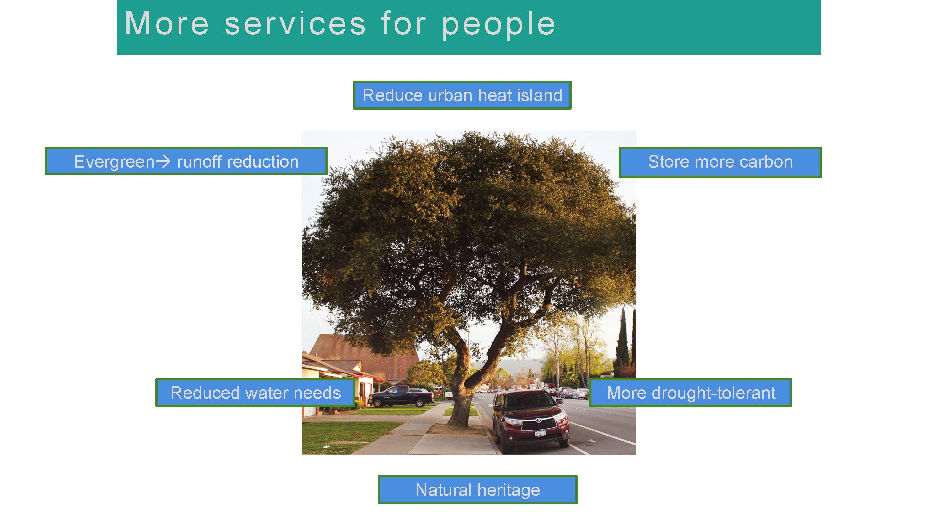 The big purples circles on the slide to the right show that about 5% of the urban street trees in the four cities are native oaks, but they are returning about 10% of the ecosystem services.